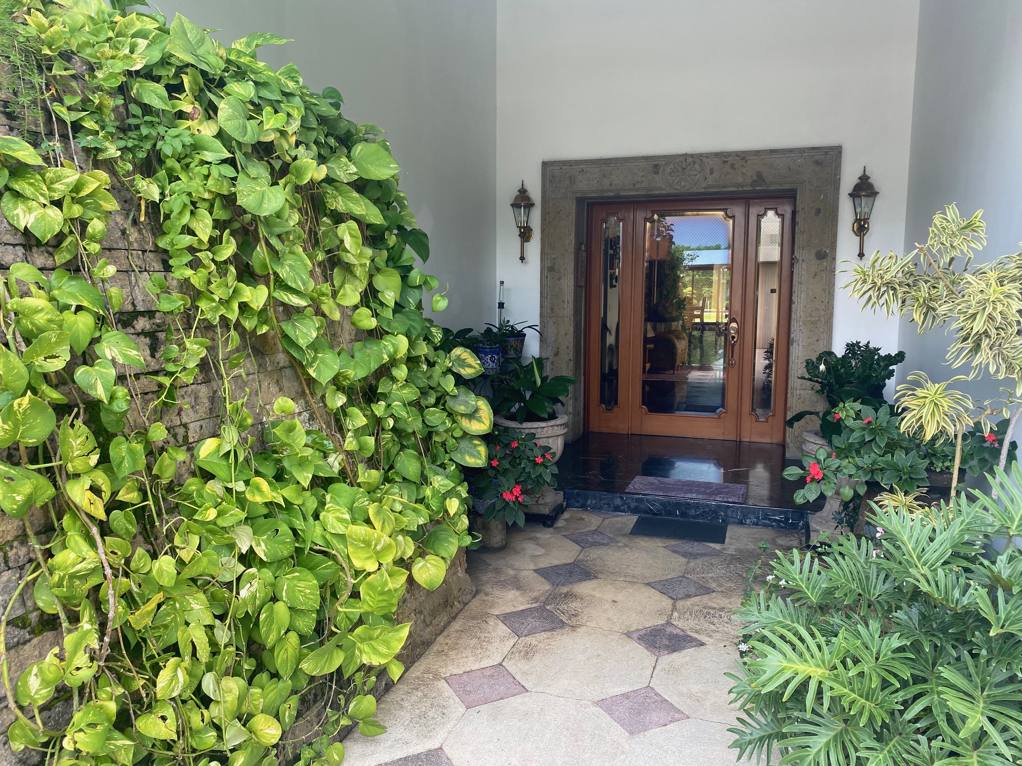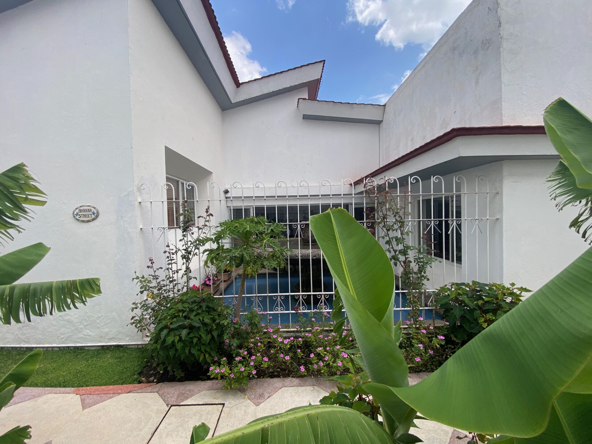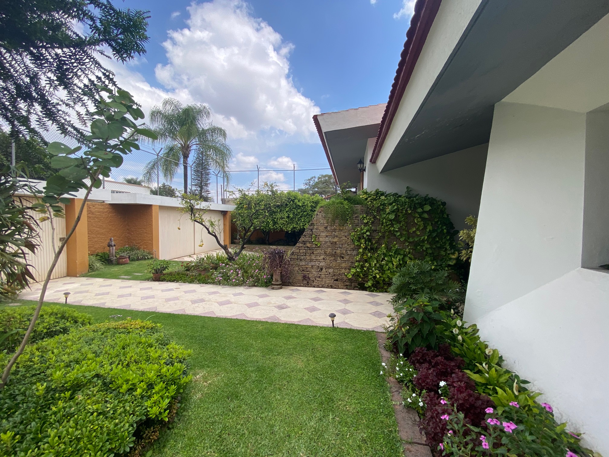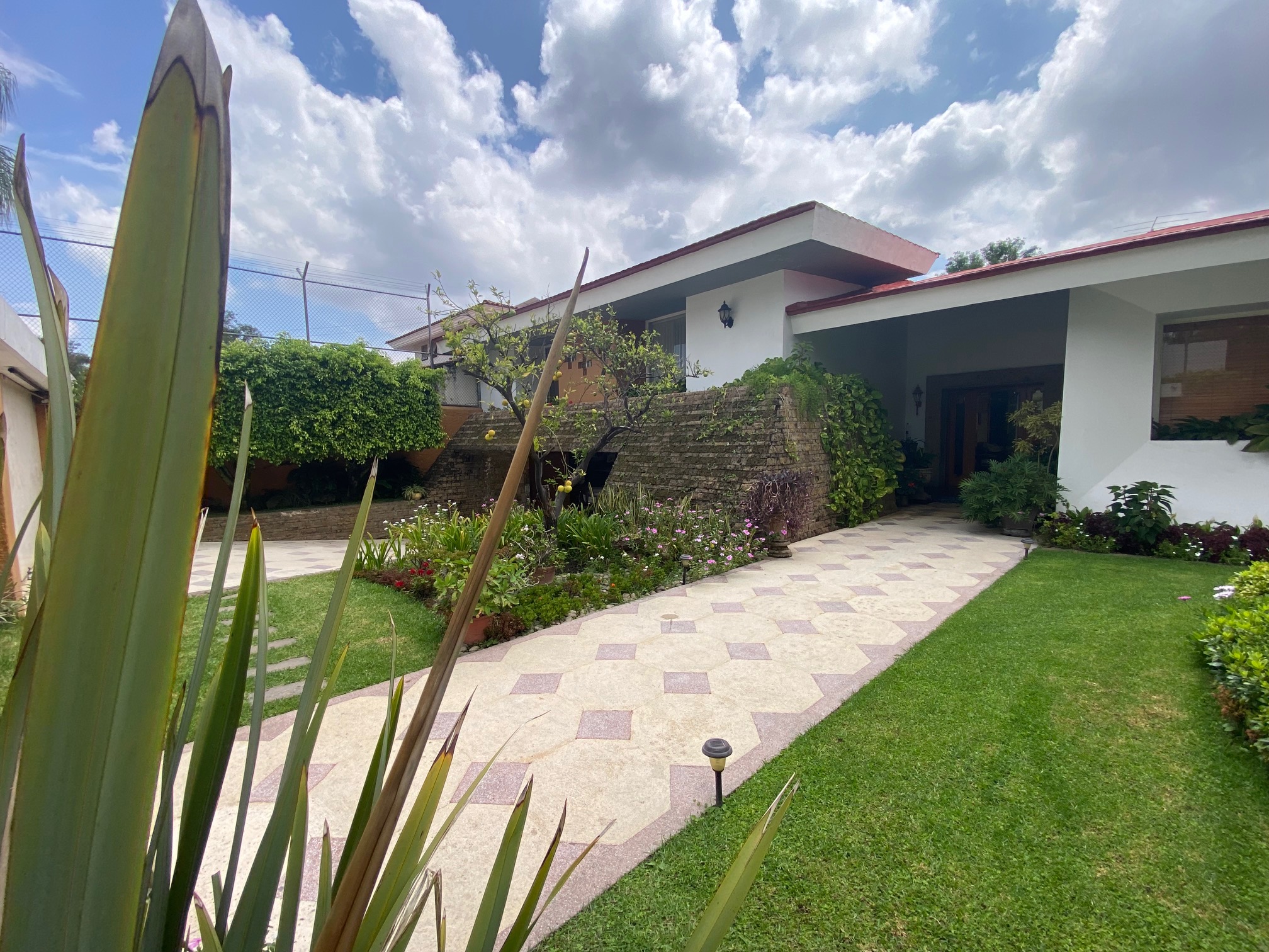 Entrada principal rodeada de jardines, portón con rampa a medio sótano con capacidad para 4 automóviles, además espacio lancha, motos y Reiser, entrada de servicio y cuarto con baño para chofer.
