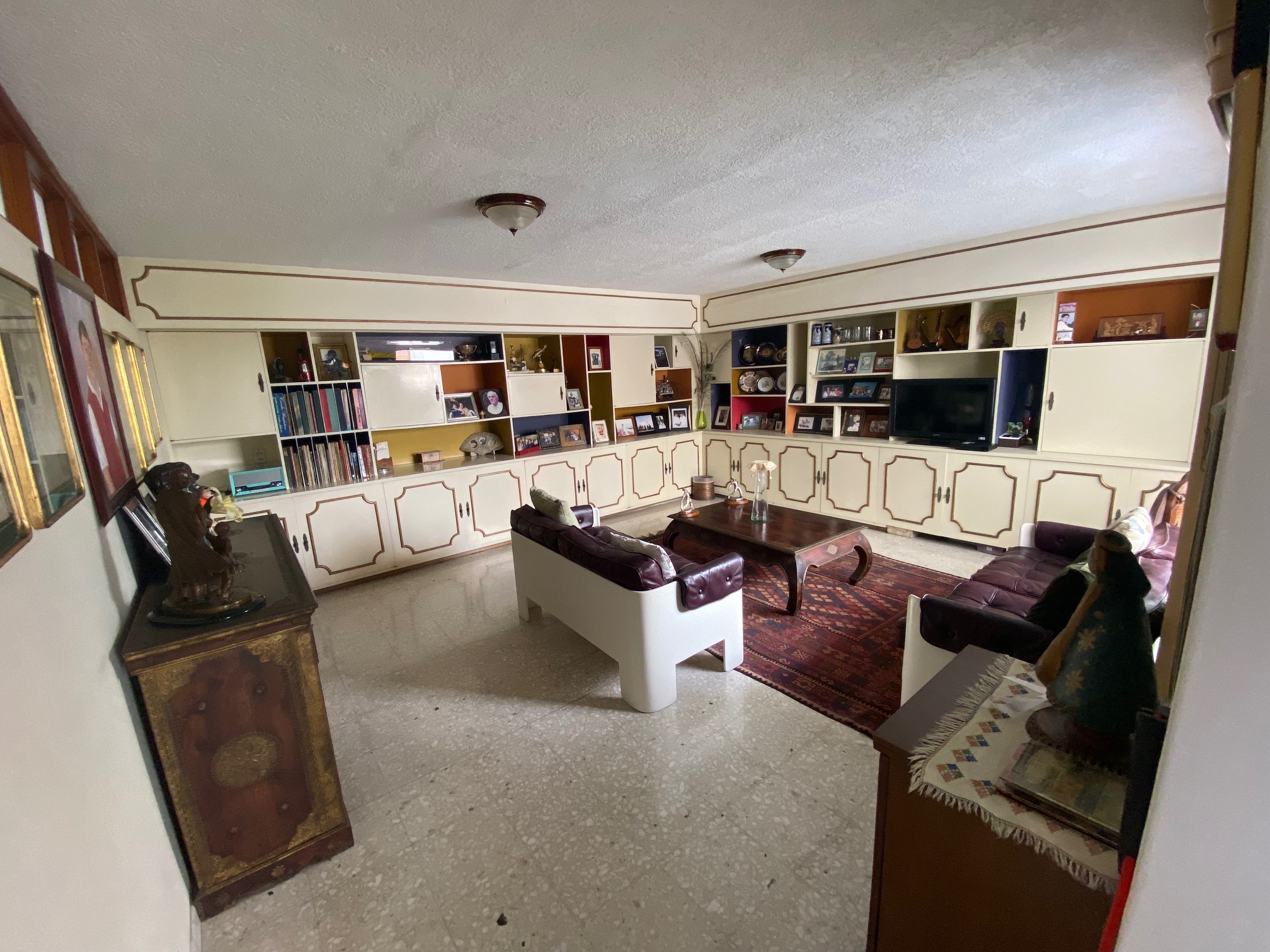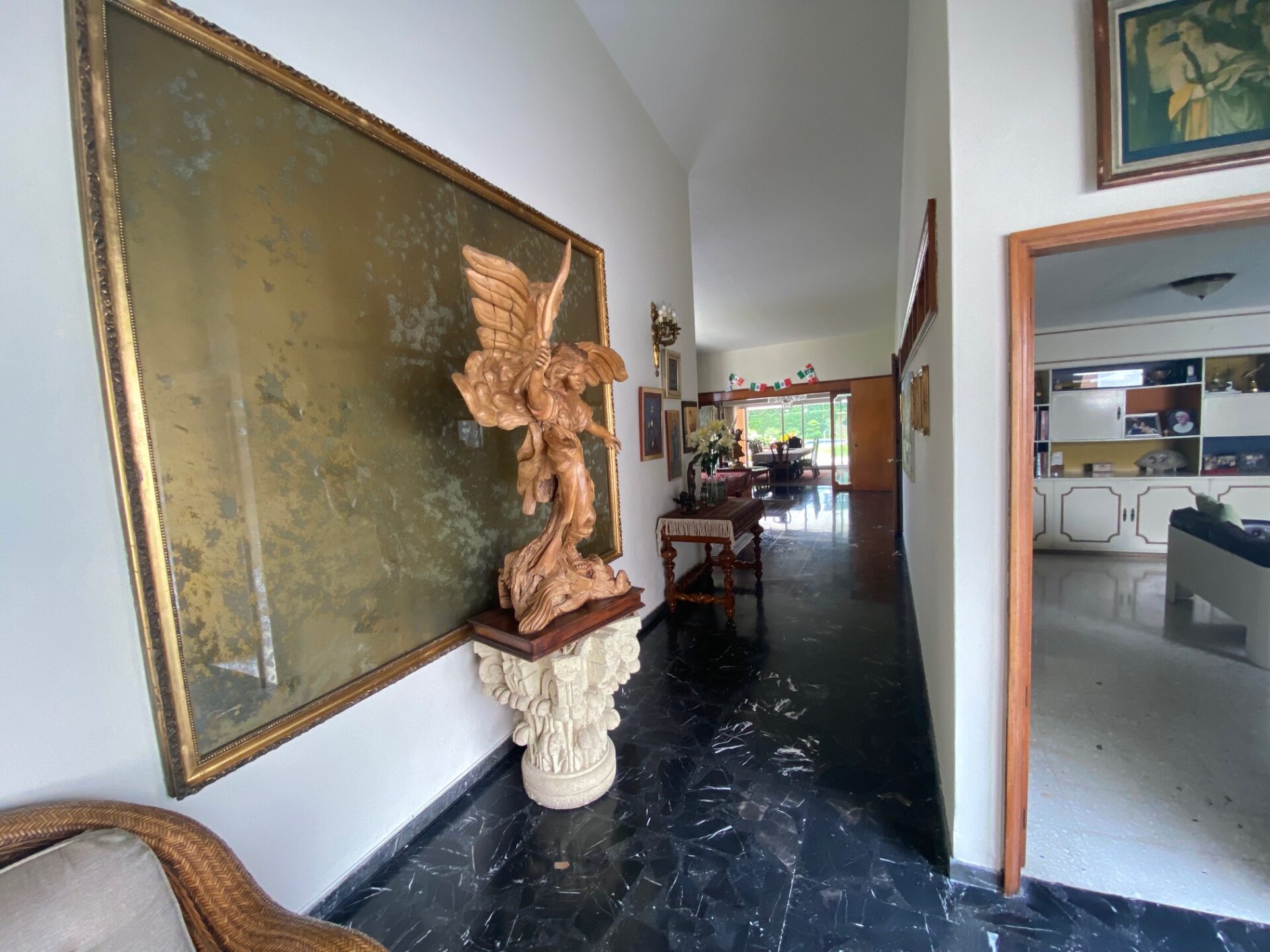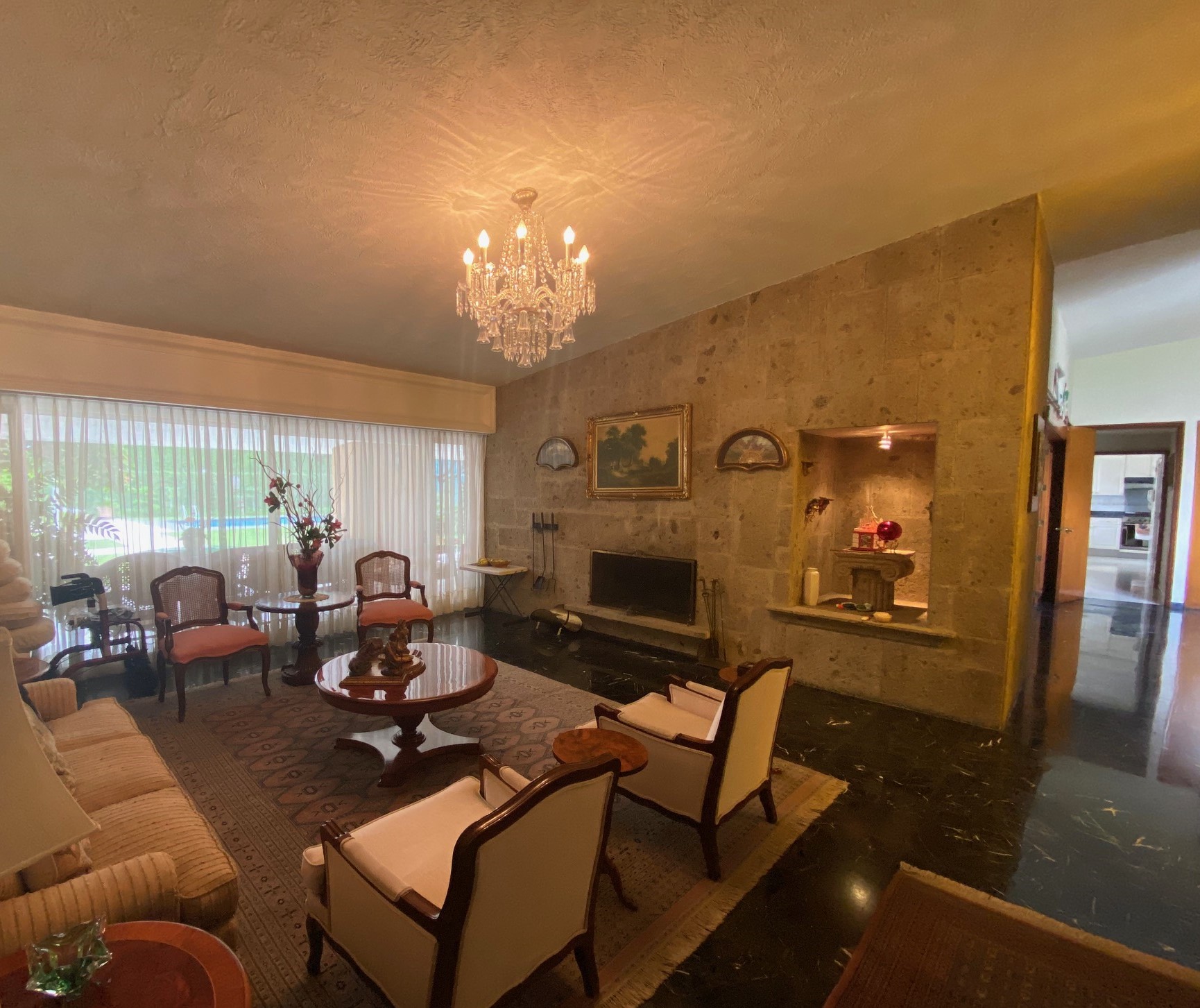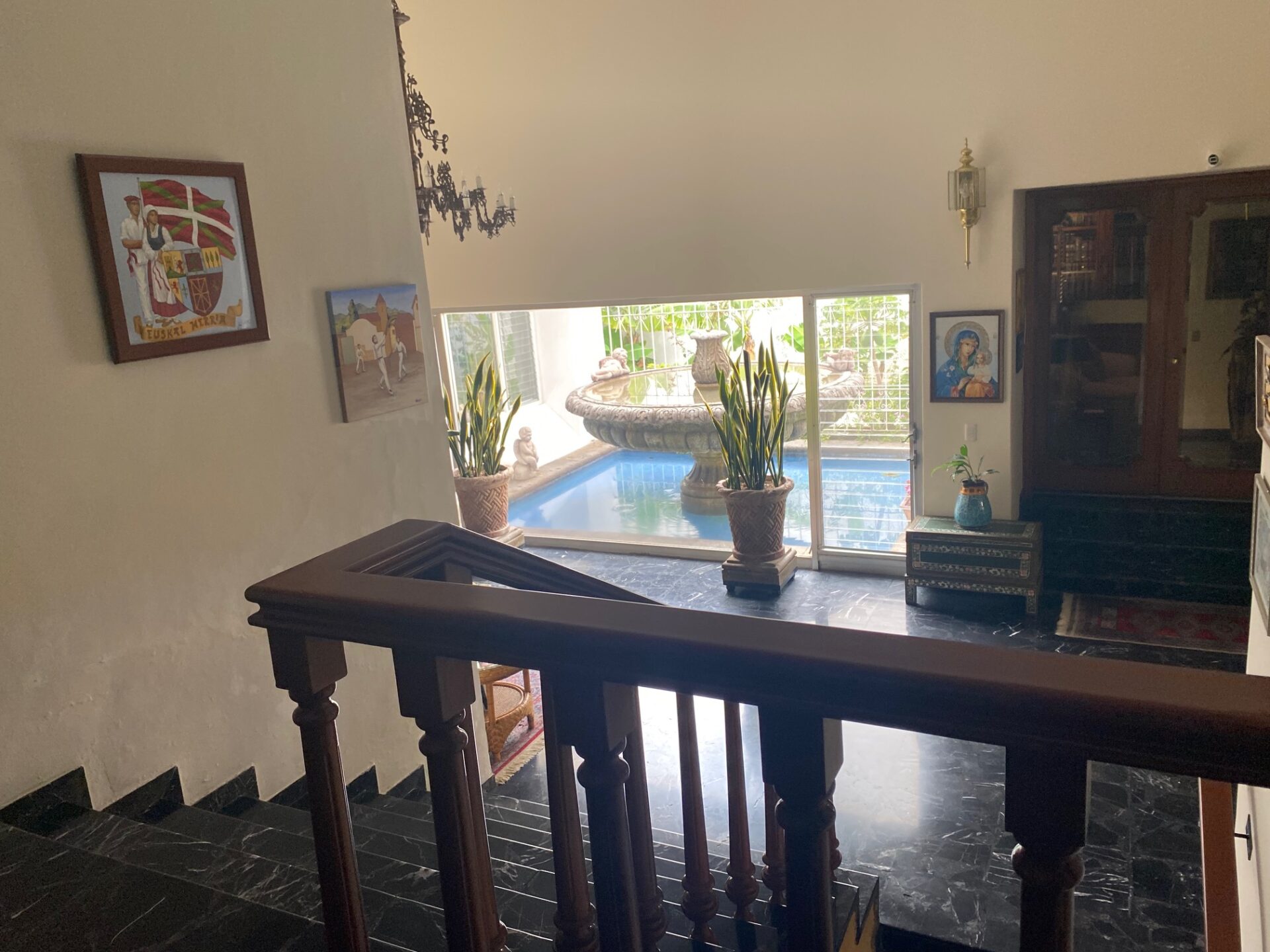 Recibidor que comunica a la escalera del medio sótano (cochera), escalera a distribuidor de 4 recamaras todas con closet 2 con baño y 2 comparten baño un closet de blancos, cubo de luz con una gran fuente de cantera, cuarto de T.V., amplio pasillo bóveda en doble altura que baja en 2 aguas a un segundo recibidor o estar, baño de visitas, cubo de luz con jardín, sala, comedor, antecomedor con puertas corredizas de cristal a la terraza y jardín, cocina integral con cubiertas de granito y despensa, escalera a segundo nivel con segunda despensa, amplio cuarto de servicio para dos personas, closet y baño, cuarto closet y área de planchado, cuarto de lavado y patio de tendido.