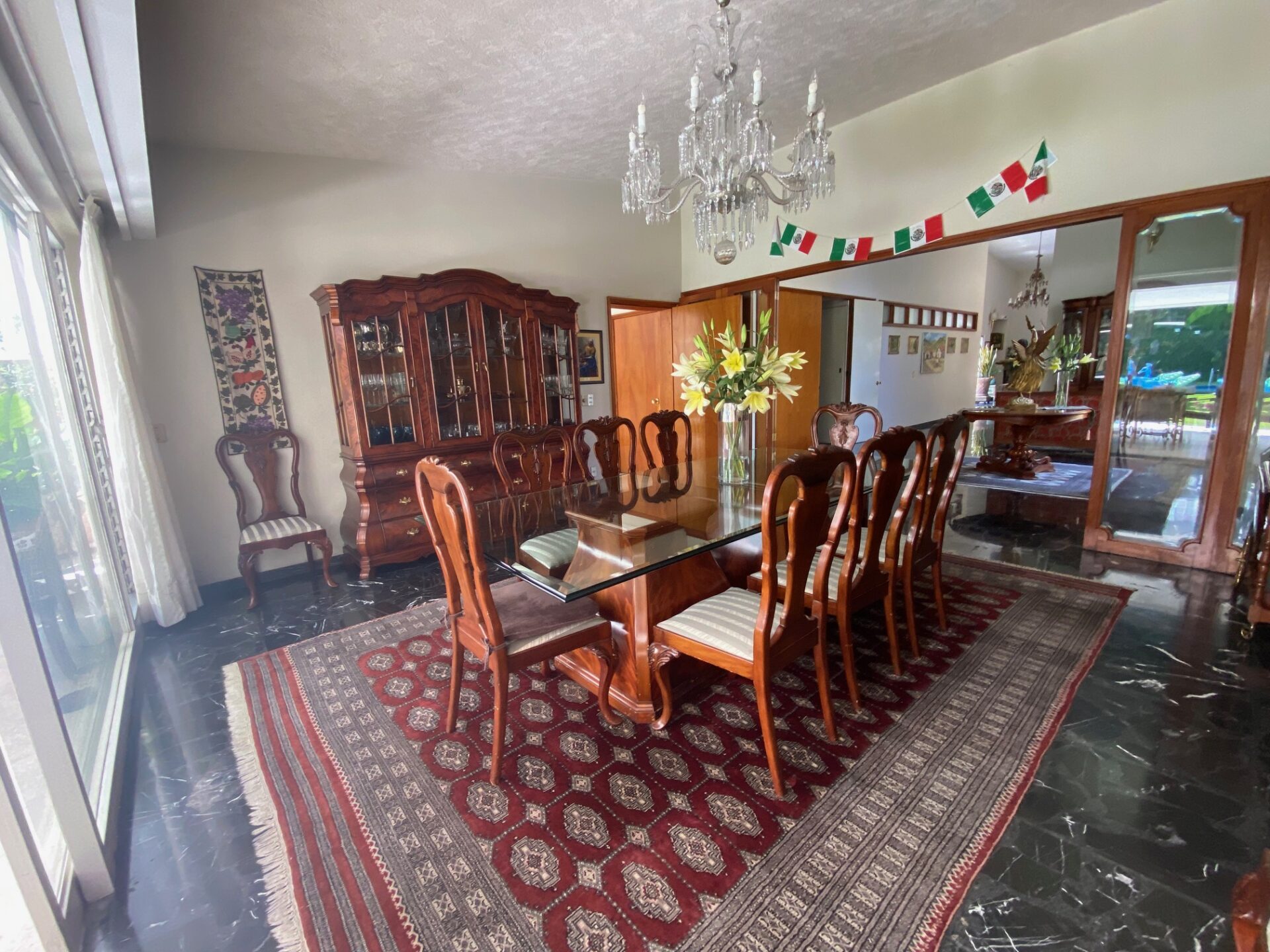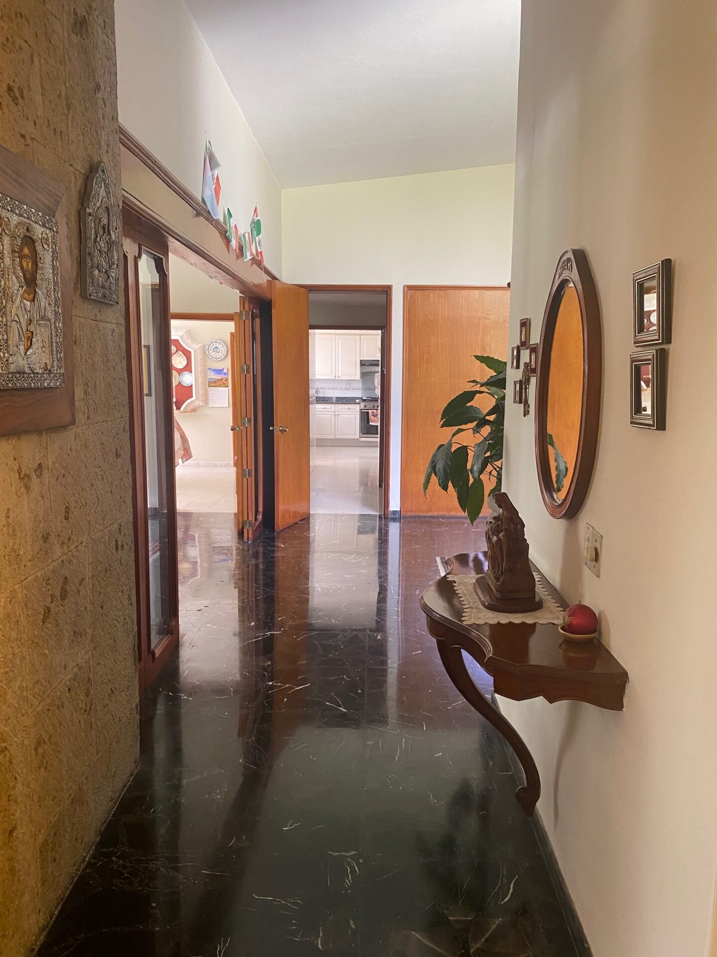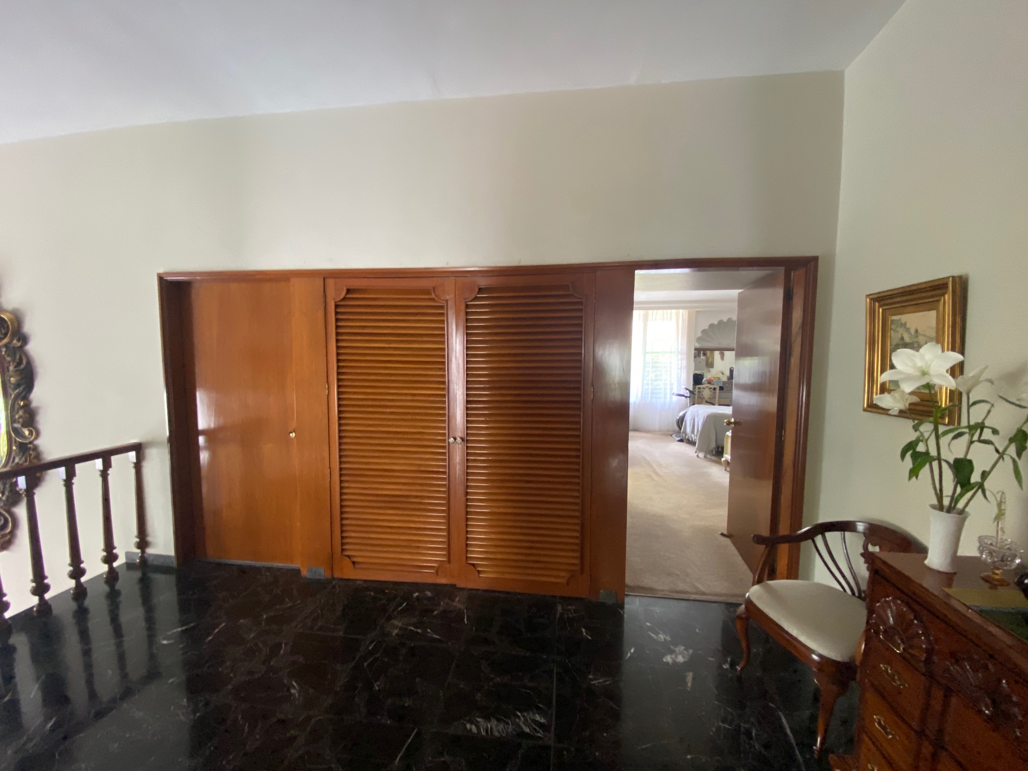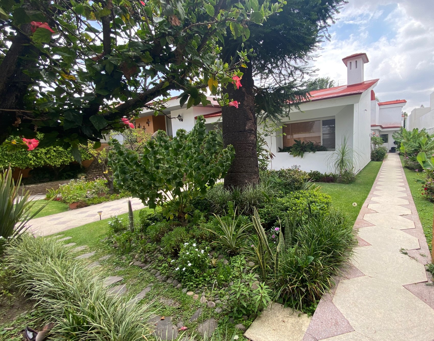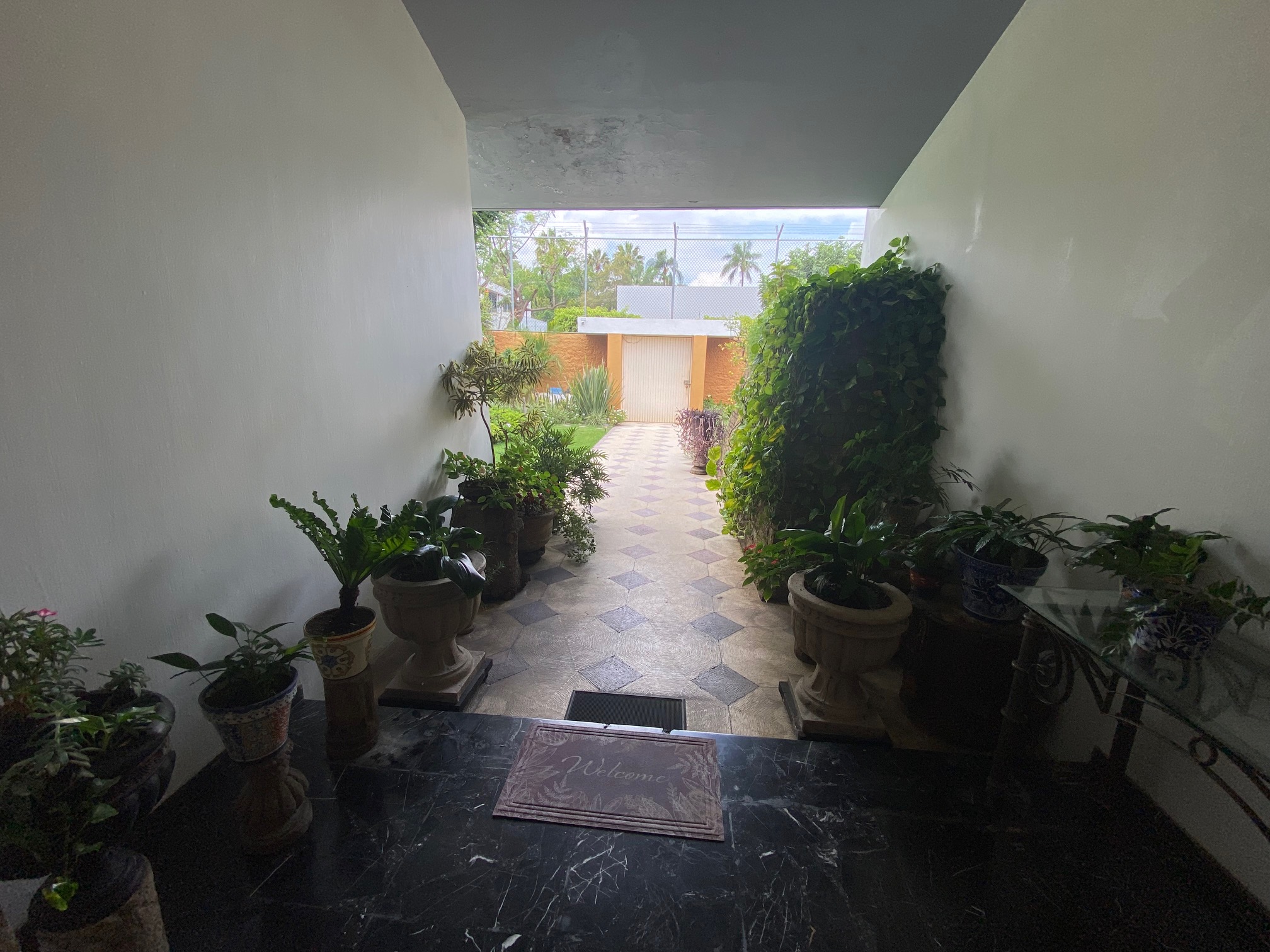 Recibidor que comunica a la escalera del medio sótano (cochera), escalera a distribuidor de 4 recamaras todas con closet 2 con baño y 2 comparten baño un closet de blancos, cubo de luz con una gran fuente de cantera, cuarto de T.V., amplio pasillo bóveda en doble altura que baja en 2 aguas a un segundo recibidor o estar, baño de visitas, cubo de luz con jardín, sala, comedor, antecomedor con puertas corredizas de cristal a la terraza y jardín, cocina integral con cubiertas de granito y despensa, escalera a segundo nivel con segunda despensa, amplio cuarto de servicio para dos personas, closet y baño, cuarto closet y área de planchado, cuarto de lavado y patio de tendido.
