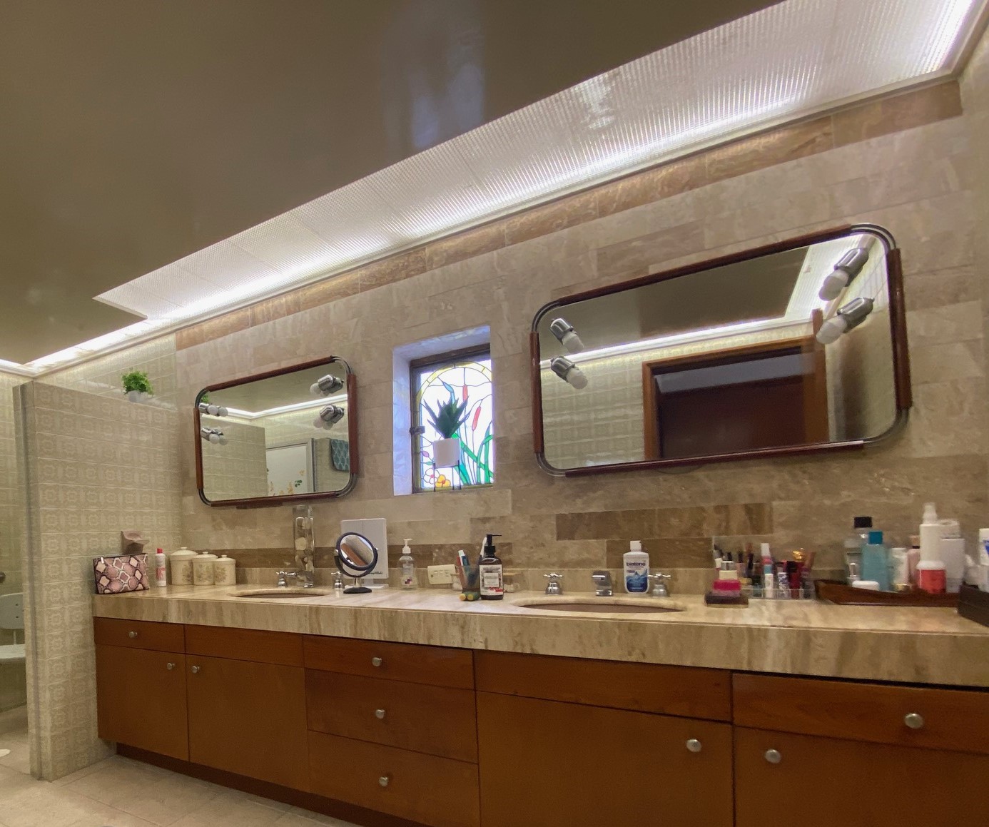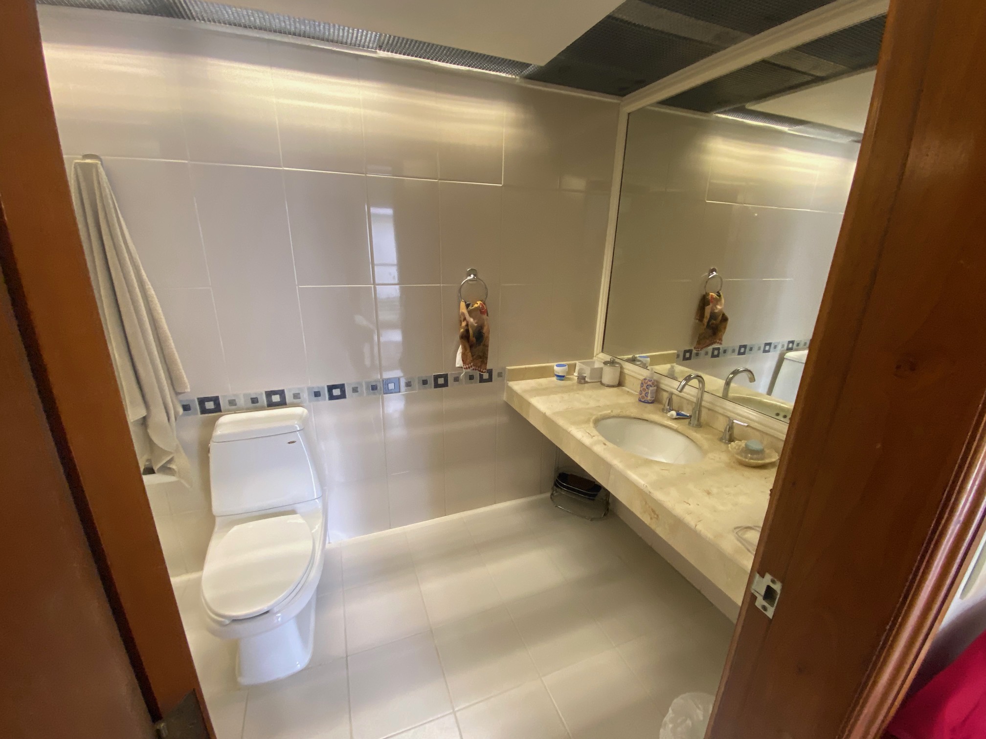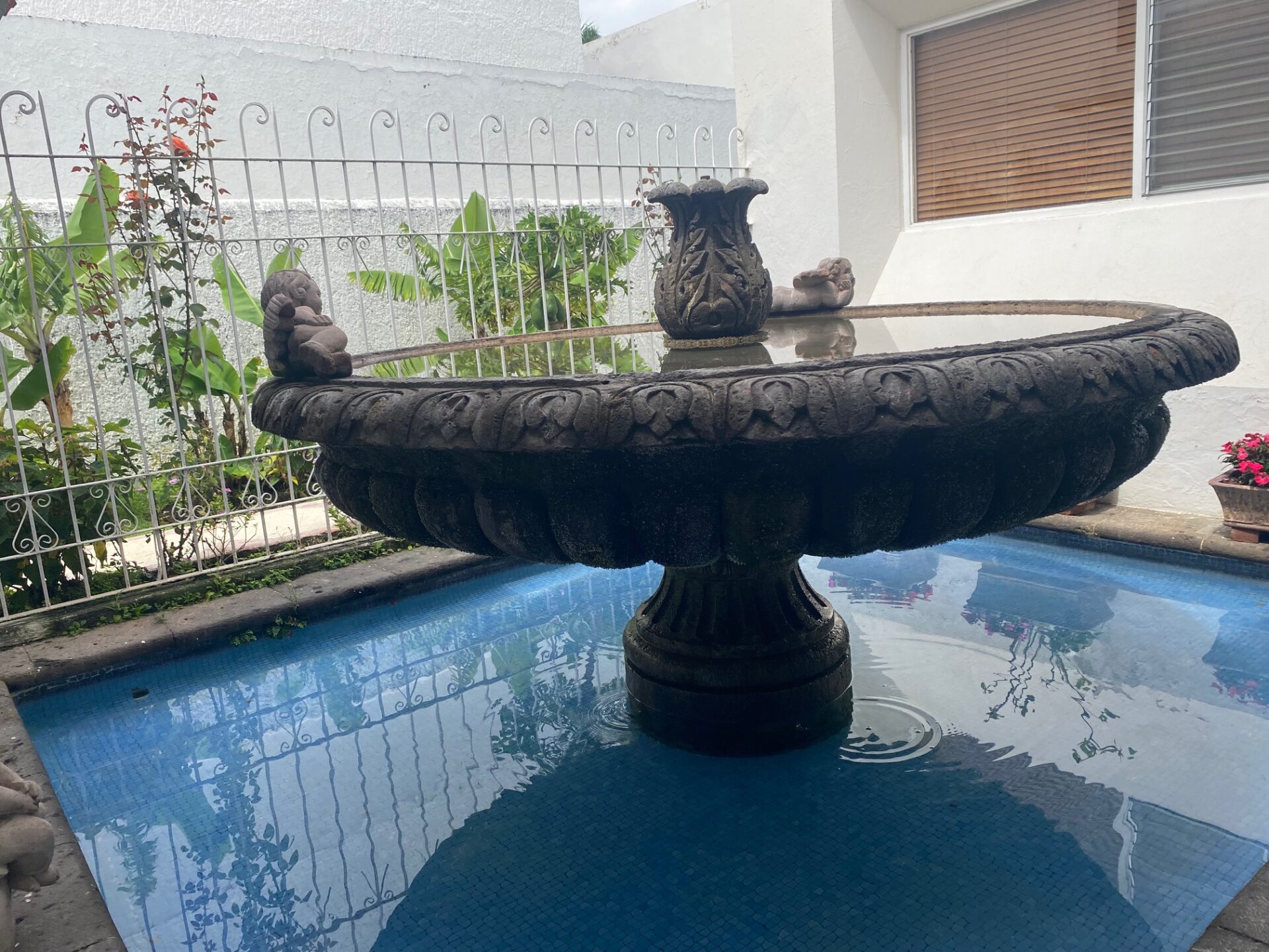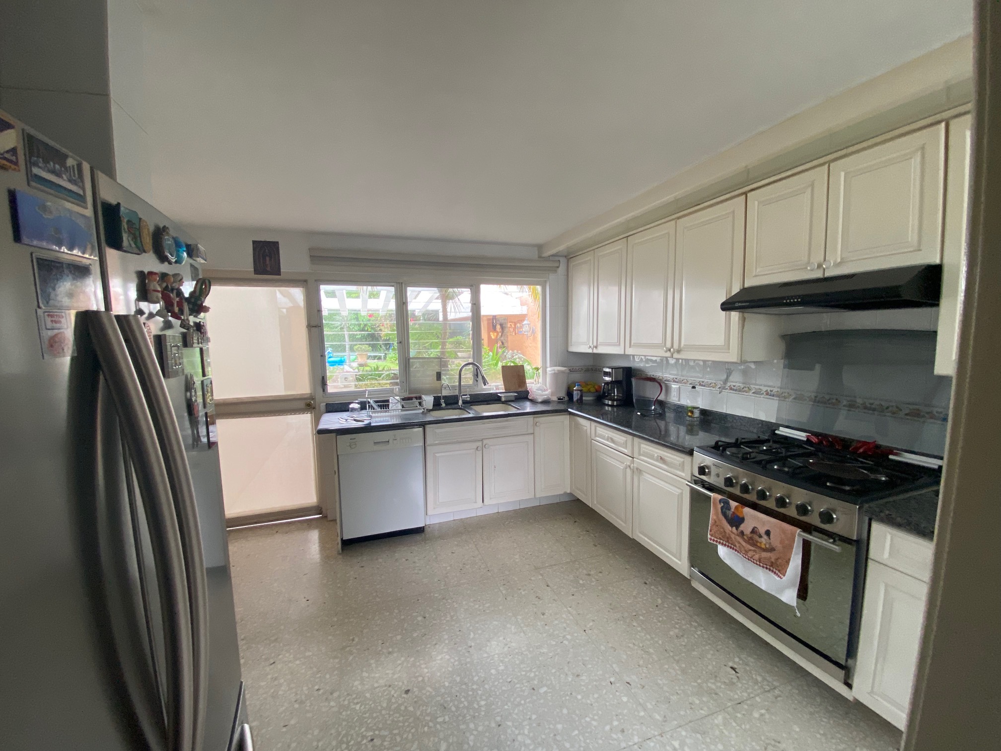 Recibidor que comunica a la escalera del medio sótano (cochera), escalera a distribuidor de 4 recamaras todas con closet 2 con baño y 2 comparten baño un closet de blancos, cubo de luz con una gran fuente de cantera, cuarto de T.V., amplio pasillo bóveda en doble altura que baja en 2 aguas a un segundo recibidor o estar, baño de visitas, cubo de luz con jardín, sala, comedor, antecomedor con puertas corredizas de cristal a la terraza y jardín, cocina integral con cubiertas de granito y despensa, escalera a segundo nivel con segunda despensa, amplio cuarto de servicio para dos personas, closet y baño, cuarto closet y área de planchado, cuarto de lavado y patio de tendido.