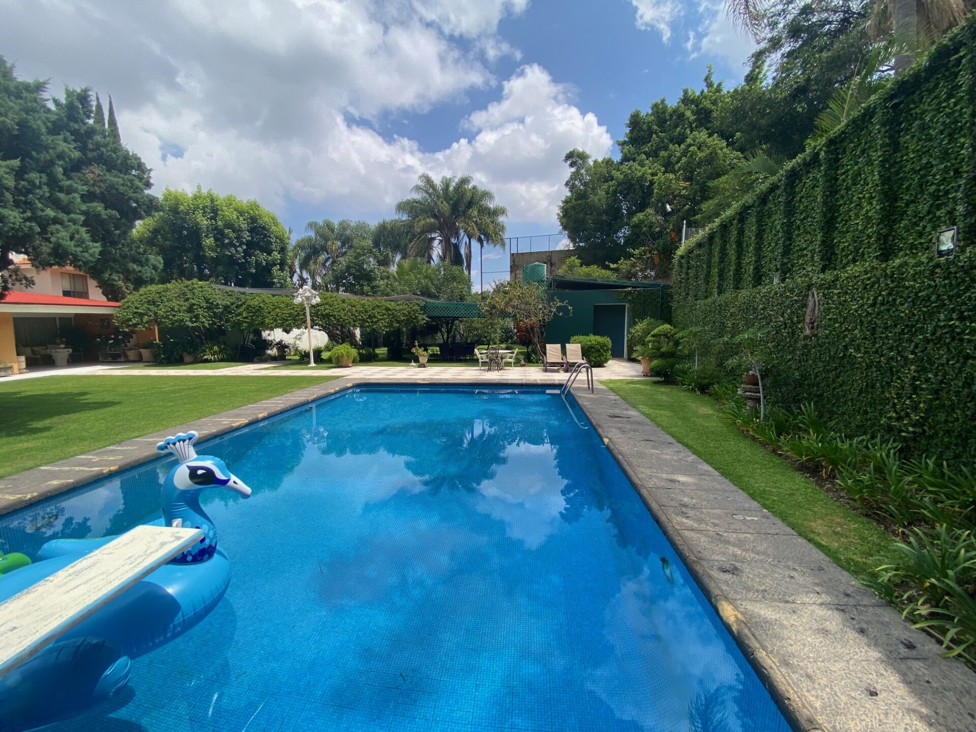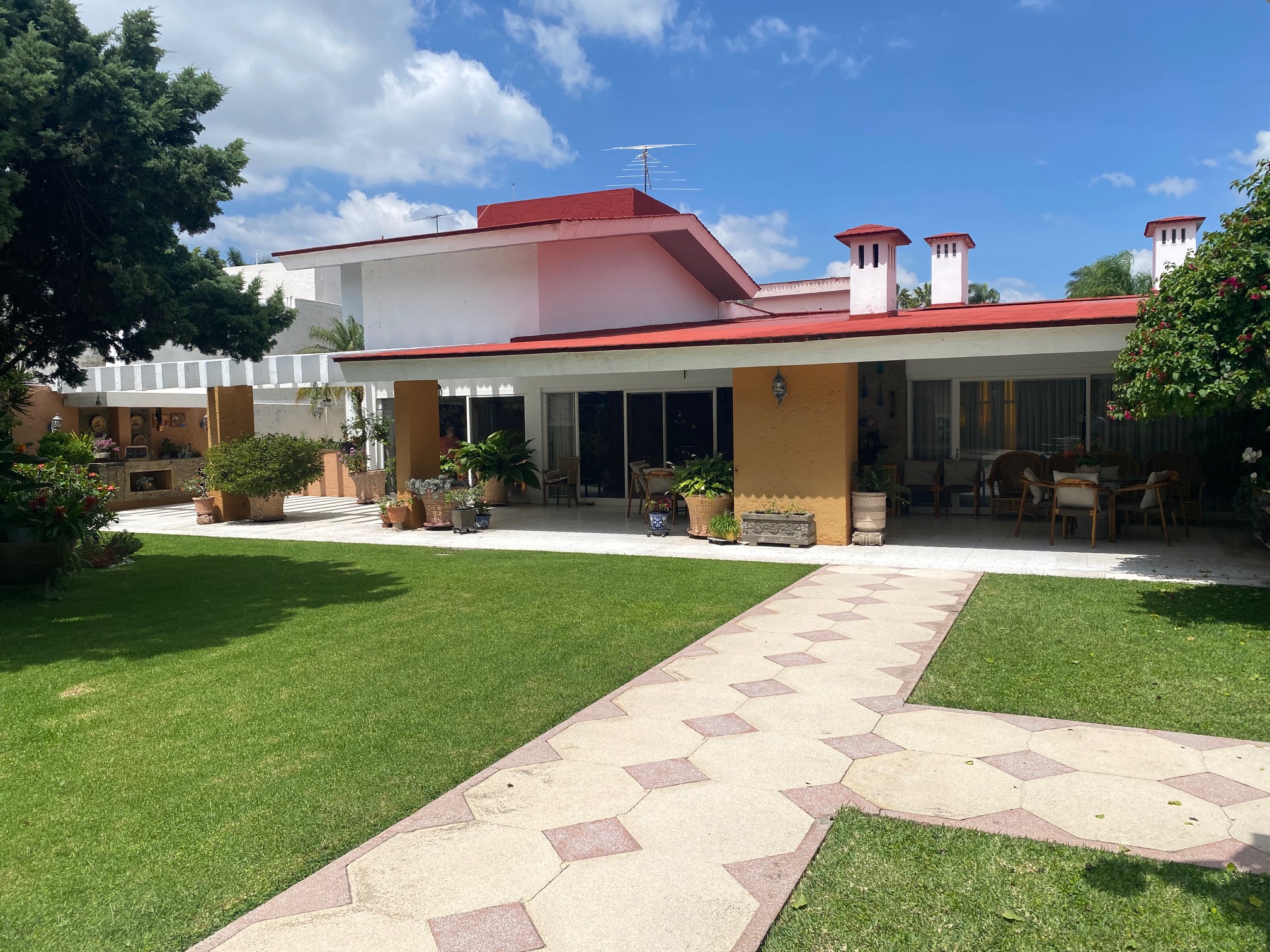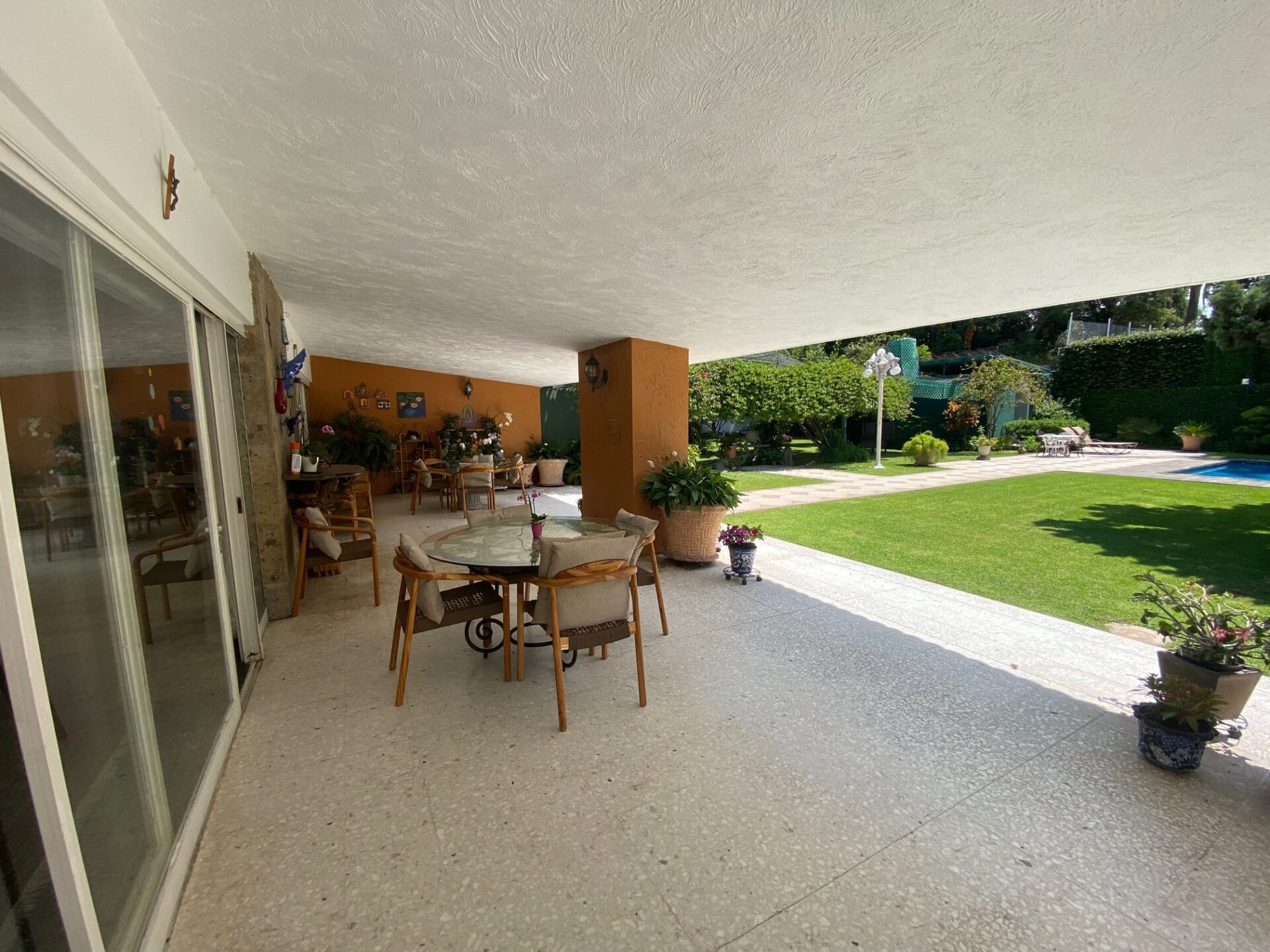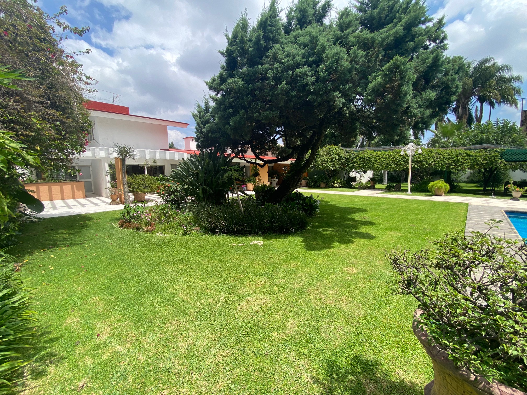 Terraza techada y con pergolado, asador con campana de material, amplio jardín con alberca climatizada, 2 baños vestidores (Hombres y Mujeres) además con un excedente de terreno en la parte posterior (jardín).