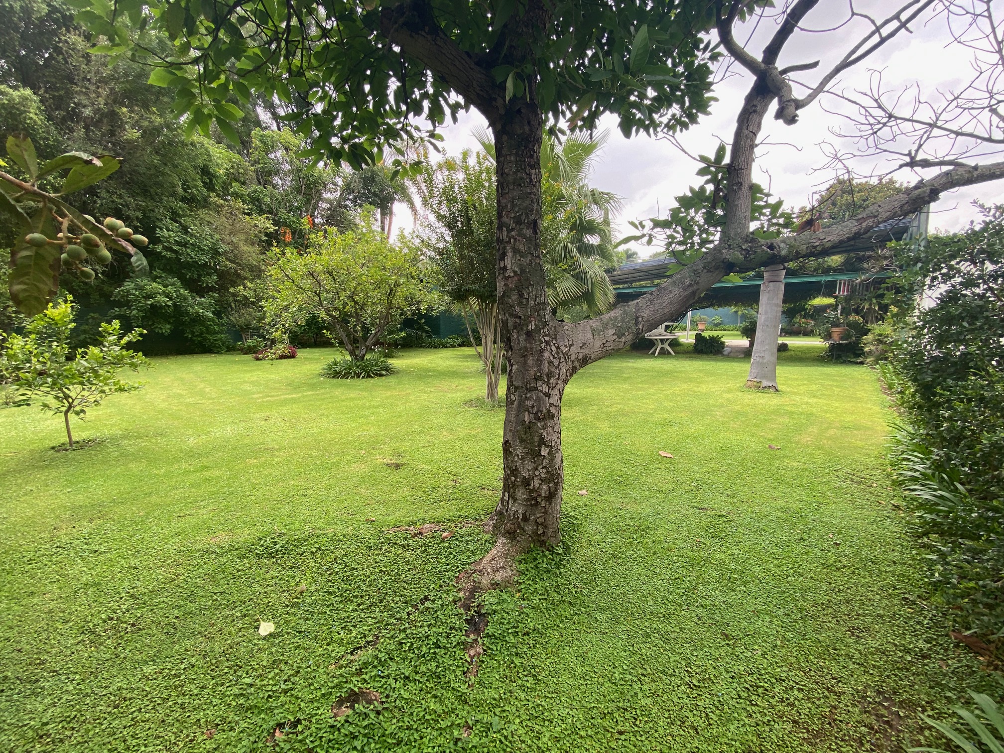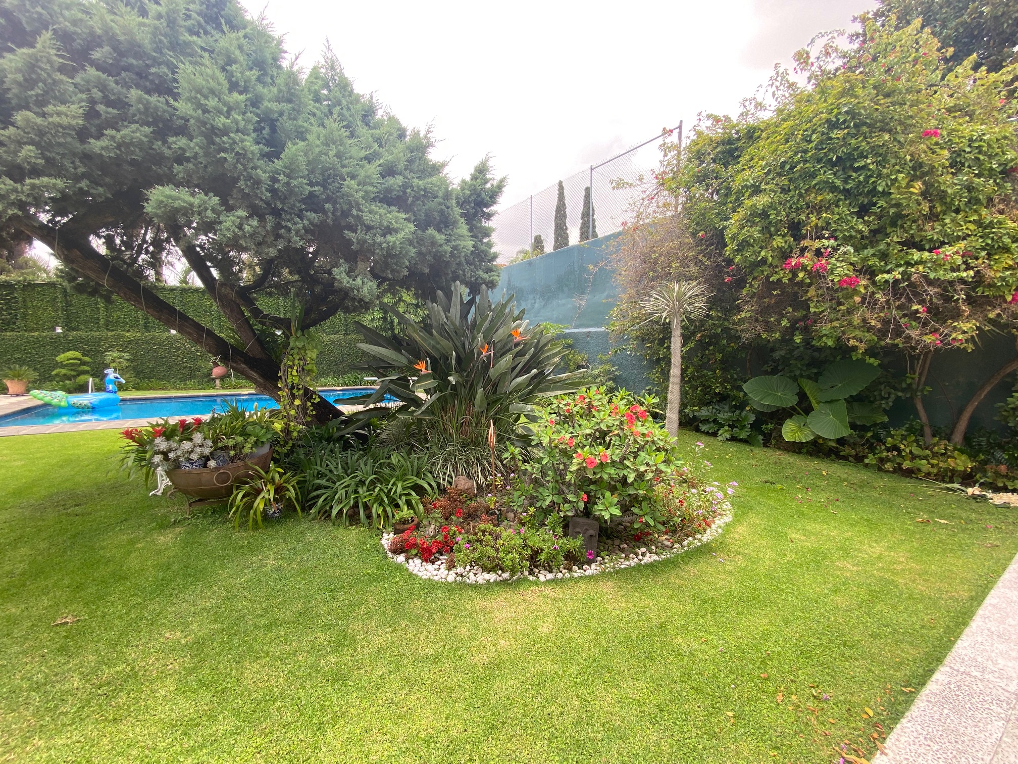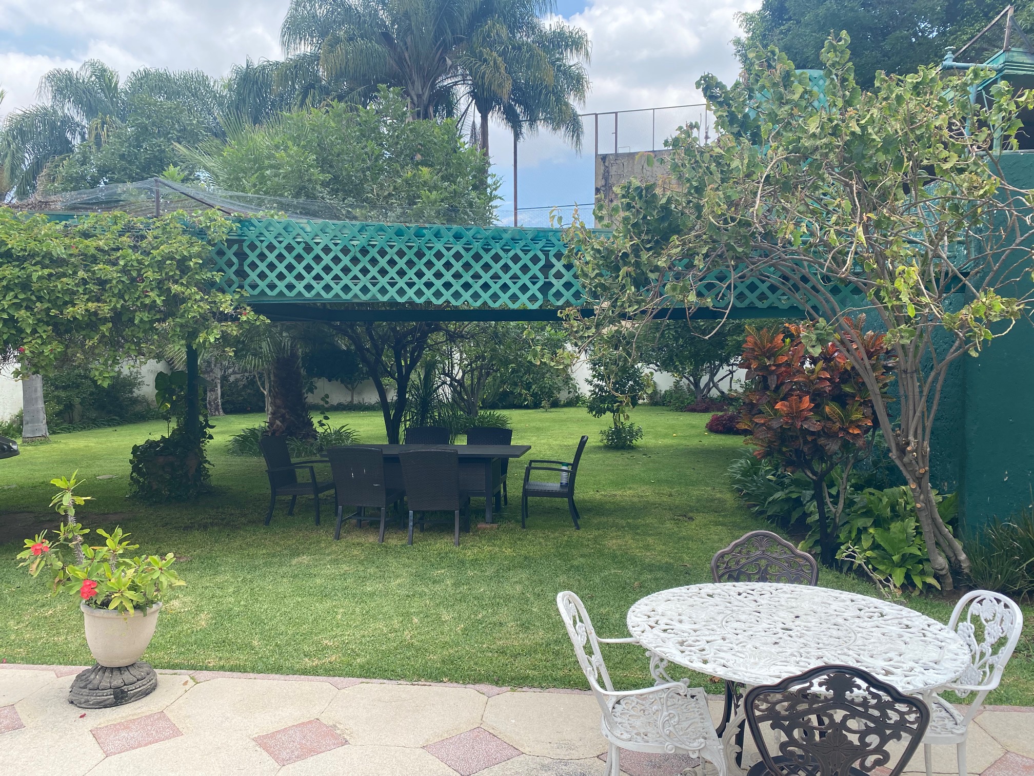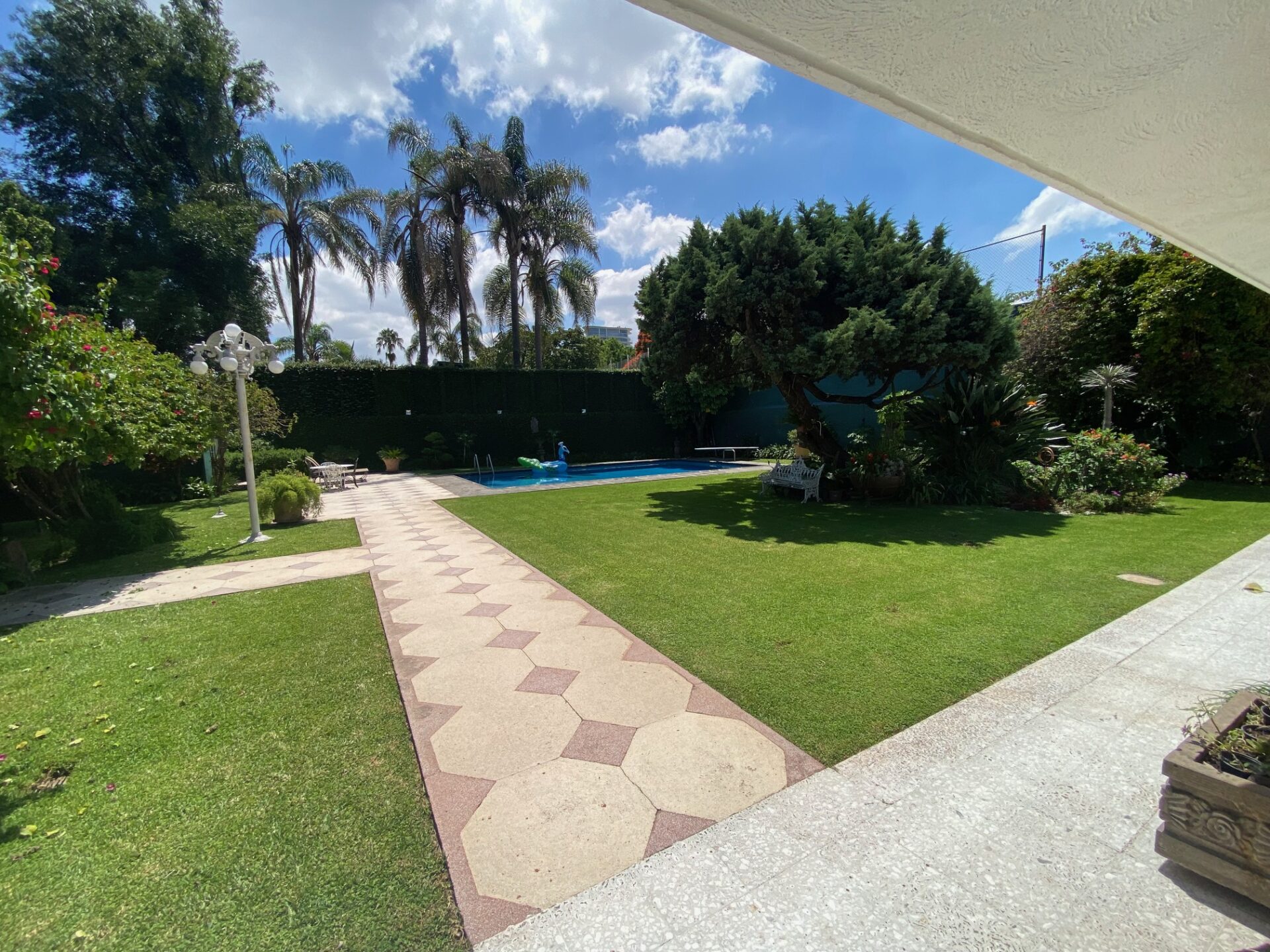 Terraza techada y con pergolado, asador con campana de material, amplio jardín con alberca climatizada, 2 baños vestidores (Hombres y Mujeres) además con un excedente de terreno en la parte posterior (jardín).