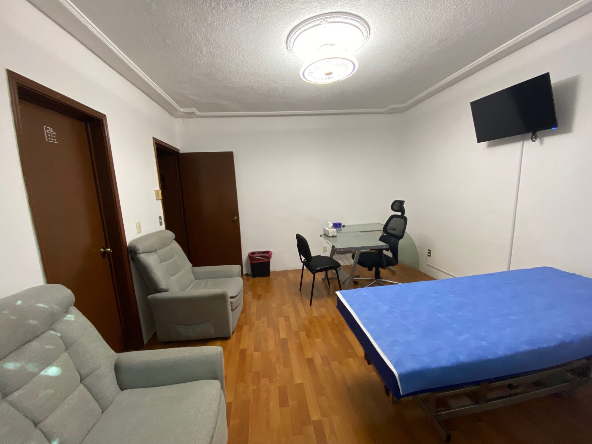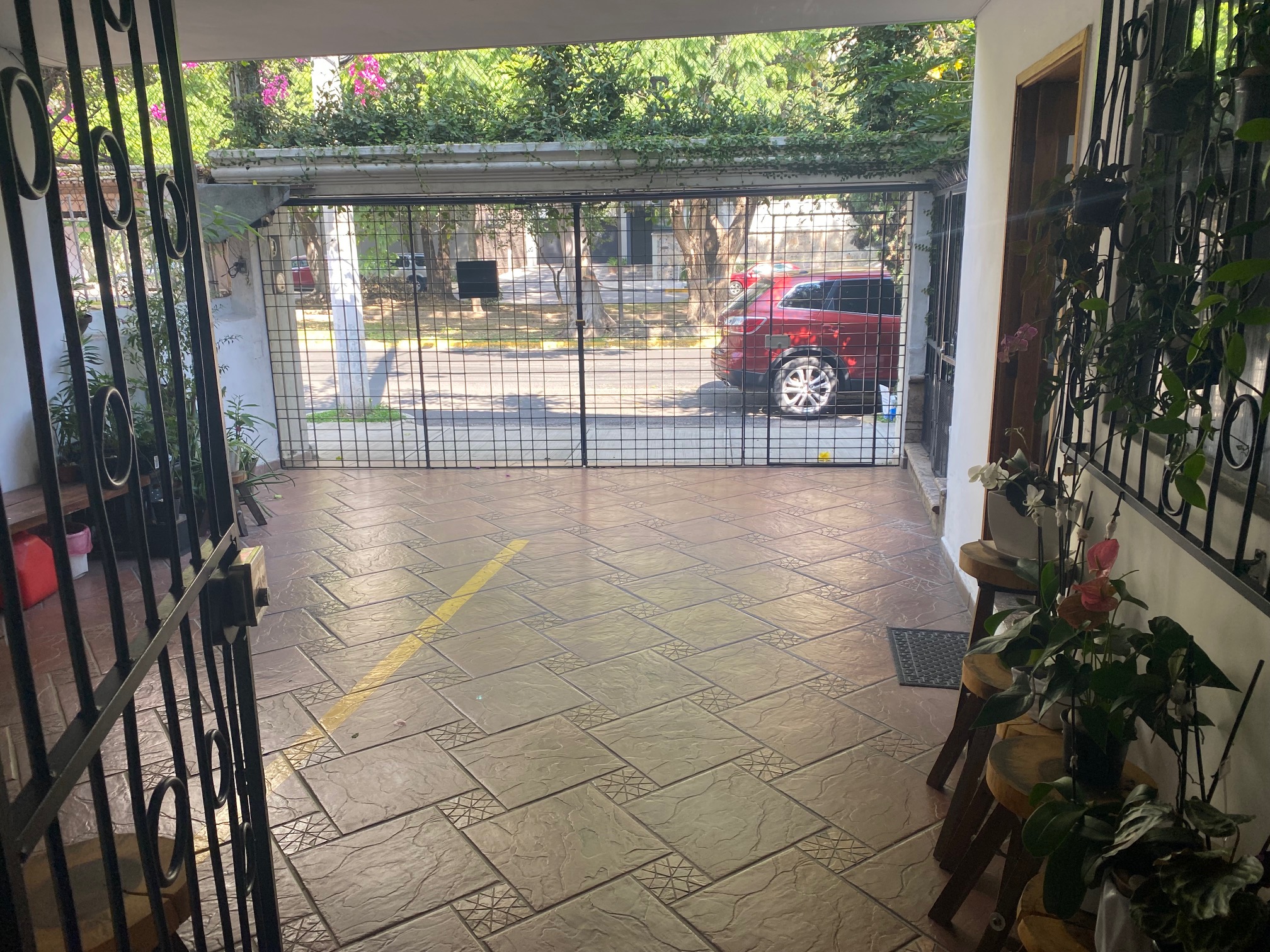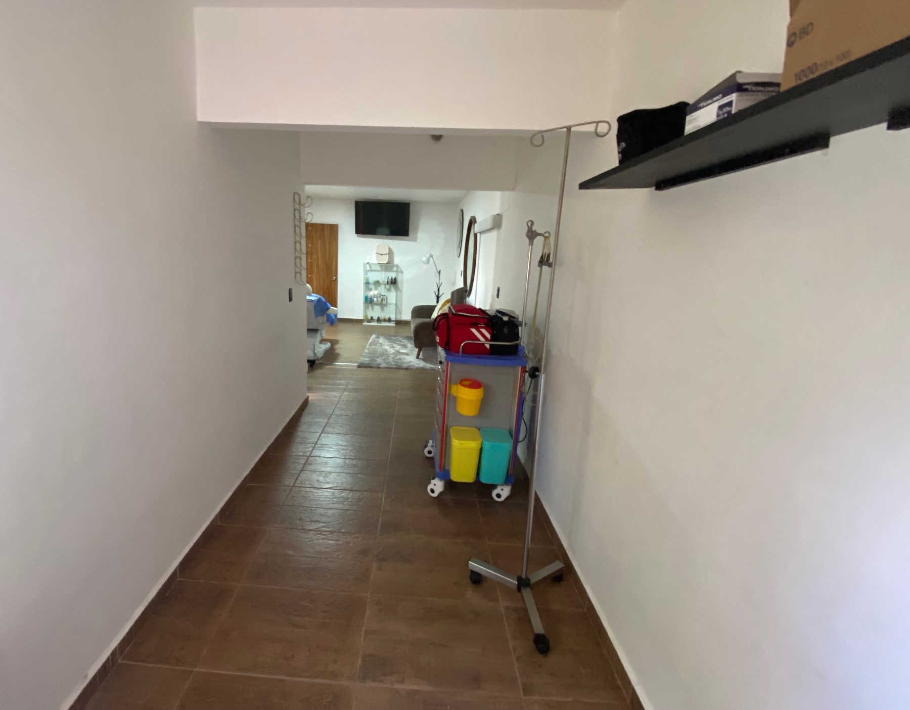 Cochera con portón eléctrico para 2 autos, cocina, recibidor, área de farmacia, 5 espacios para terapia, 2 baños completos, 2 oficinas con closet comparten baño y patio con plantas.