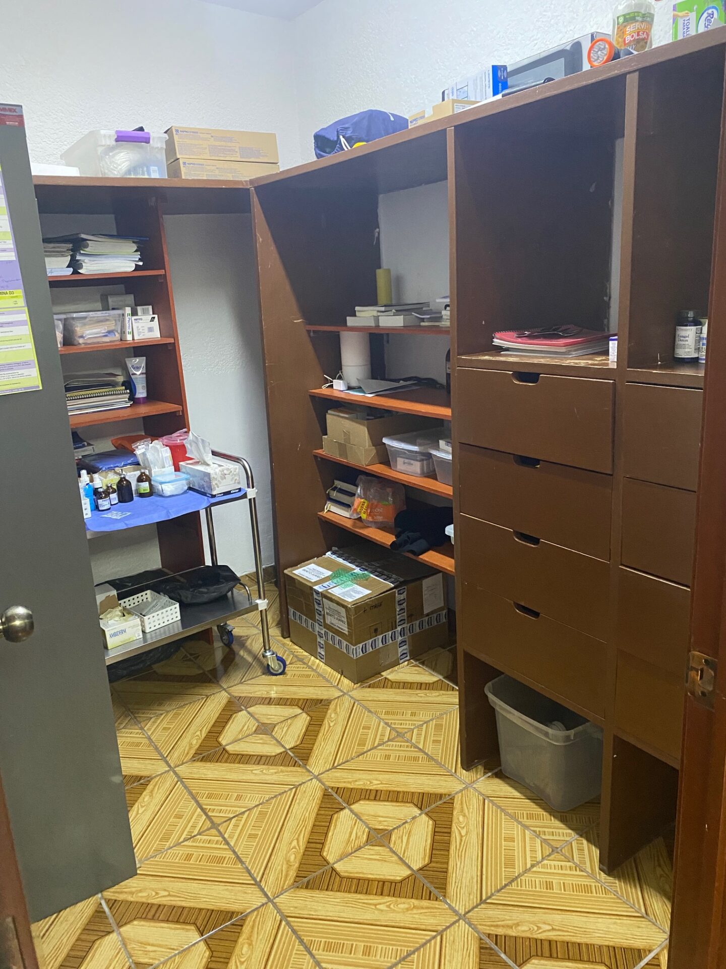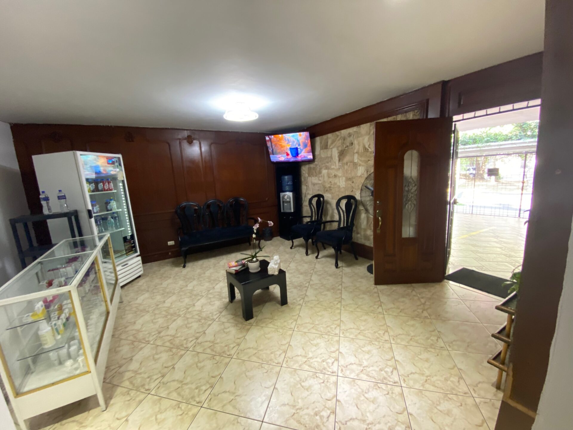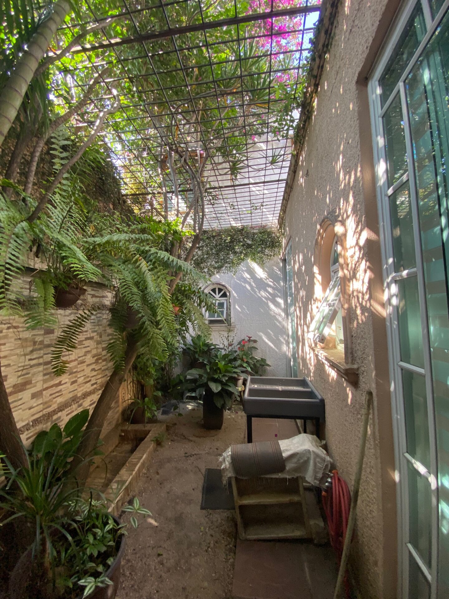 Cochera con portón eléctrico para 2 autos, cocina, recibidor, área de farmacia, 5 espacios para terapia, 2 baños completos, 2 oficinas con closet comparten baño y patio con plantas.