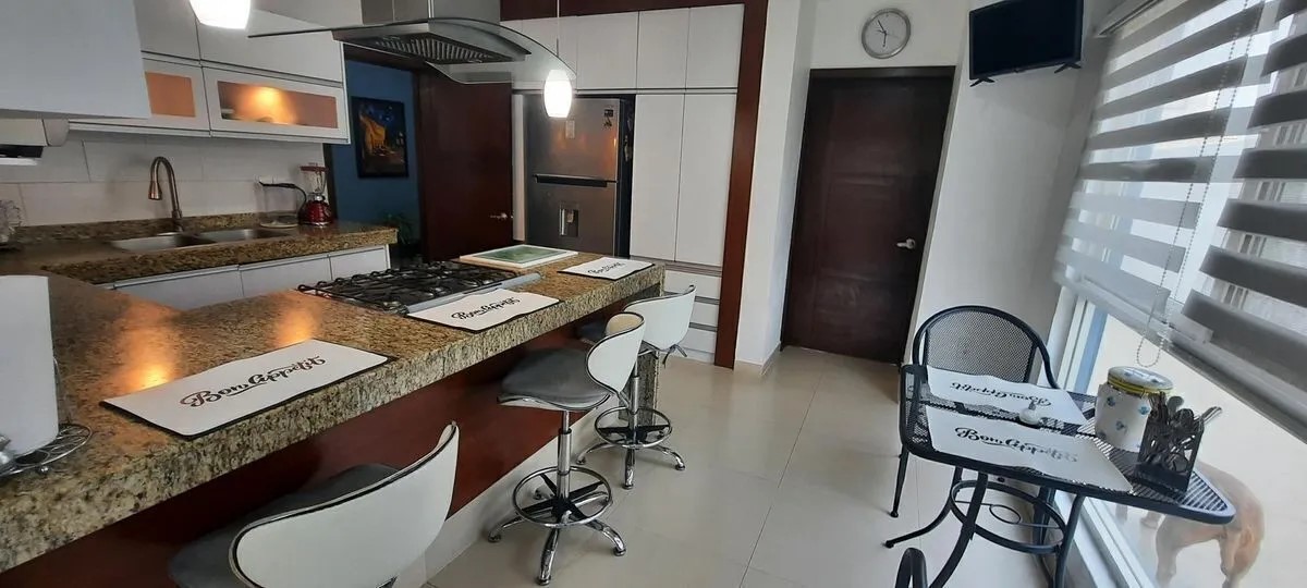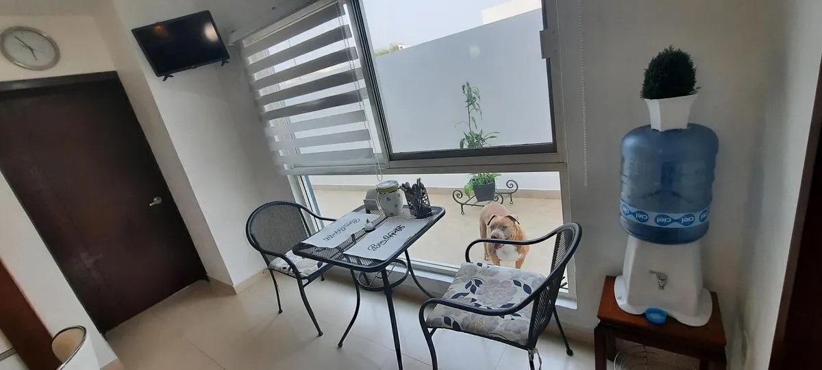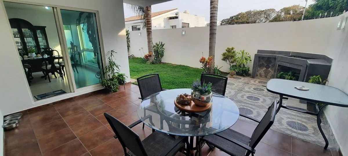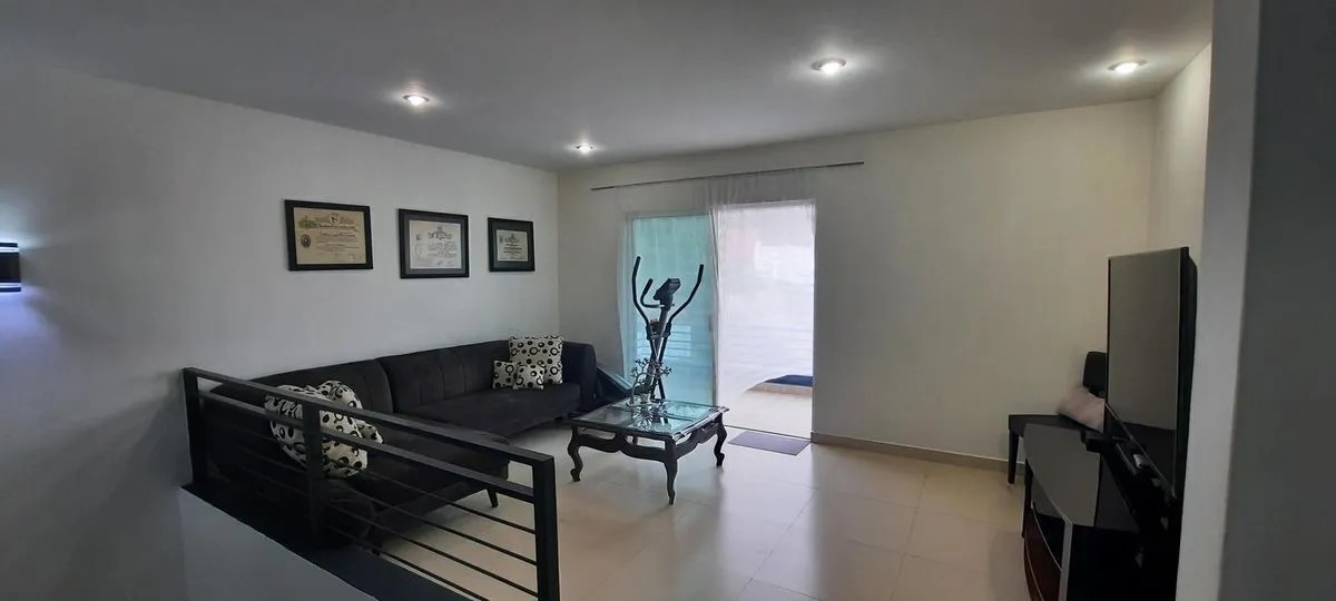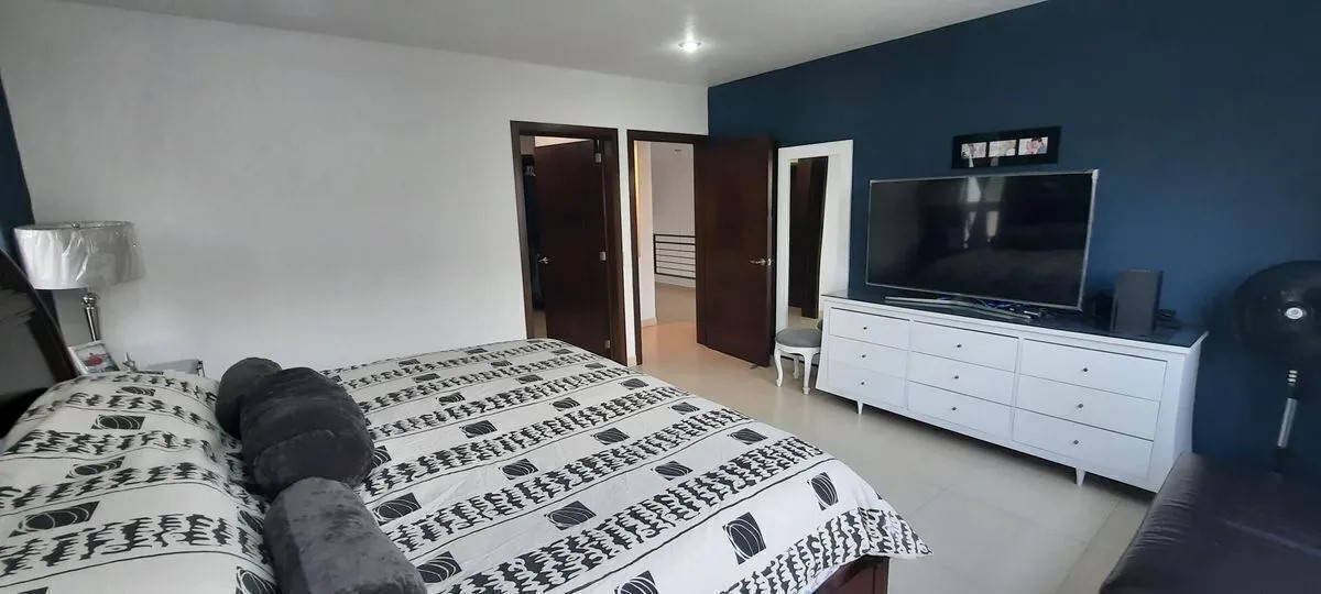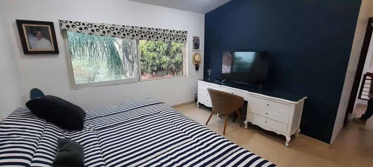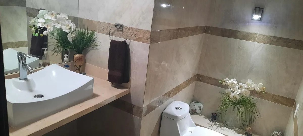 3 recámaras (dos de ellas con vestidor), 3 baños completos, 1 medio baño, 1 baño de servicio, sala con techo en la sala a doble altura, comedor, doble ovalin en 2 de los baños, servidumbre lateral, estudio y estar de tv, cocina integral con barra de granito y mármol, terraza 50m2, 30m2 de jardín, se permiten mascotas.