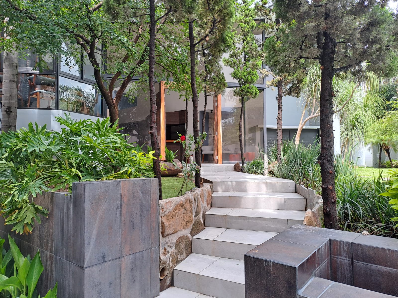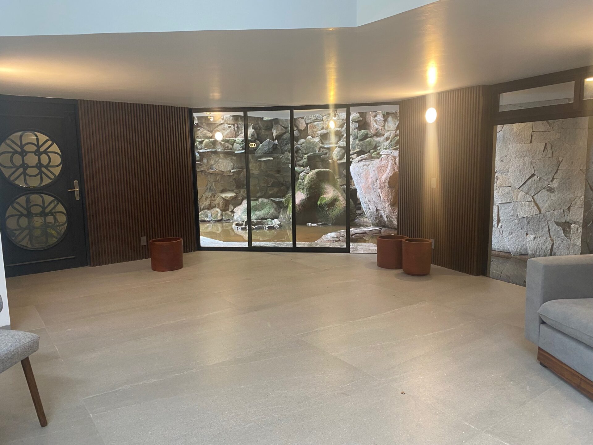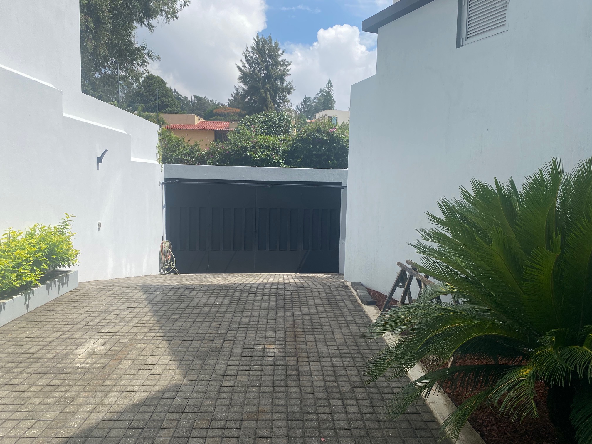 En la entrada un pasillo con un muro llorón que lleva a unos escalones a el jardín y entrada a la casa o si sigue derecho a una impresionante cascada con yacimiento natural de agua y entrada a la sala.