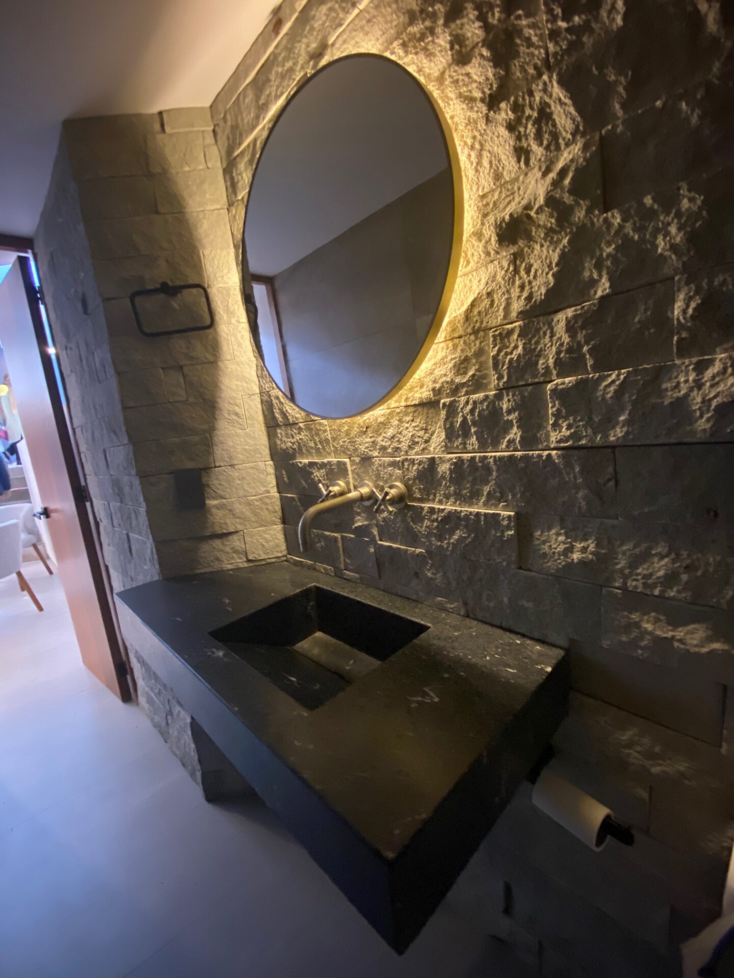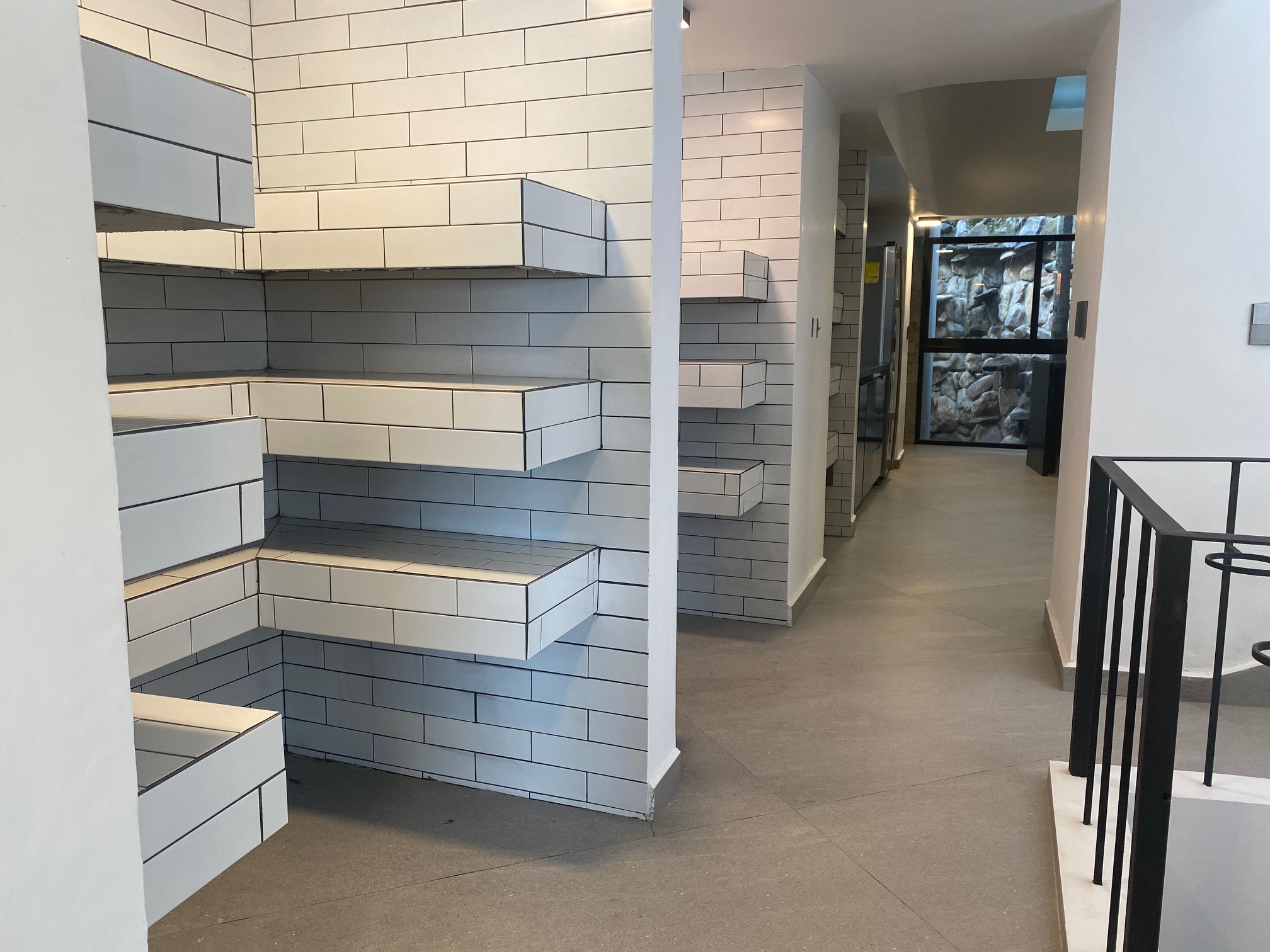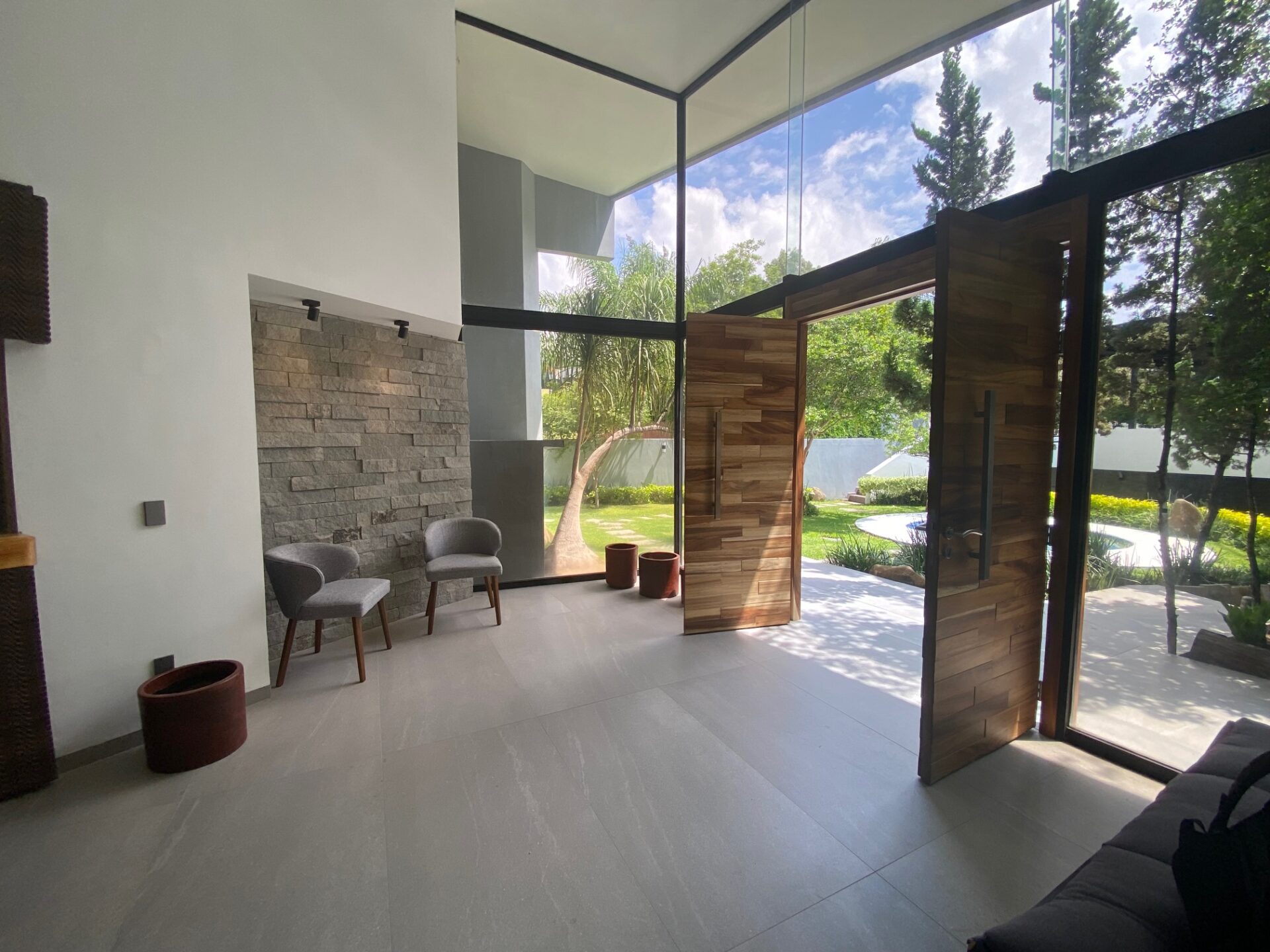 En la entrada un pasillo con un muro llorón que lleva a unos escalones a el jardín y entrada a la casa o si sigue derecho a una impresionante cascada con yacimiento natural de agua y entrada a la sala.