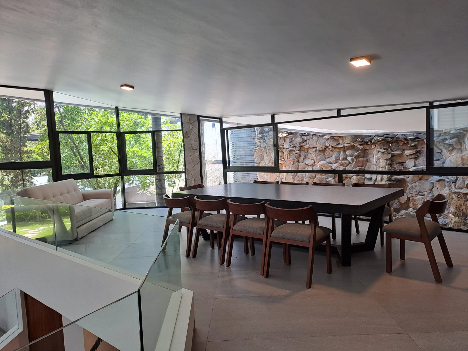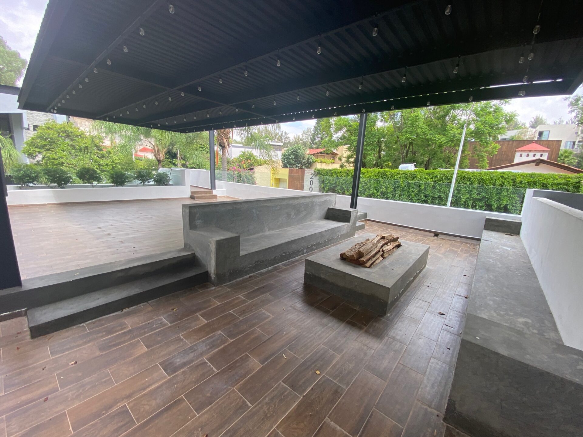 Arriba de la cochera techada una amplia terraza con vista hacia paseo de la cañada y al jardín, cuenta con fogatero con unas bancas de concreto pulido, iluminación led area para fiestas o eventos familiares.