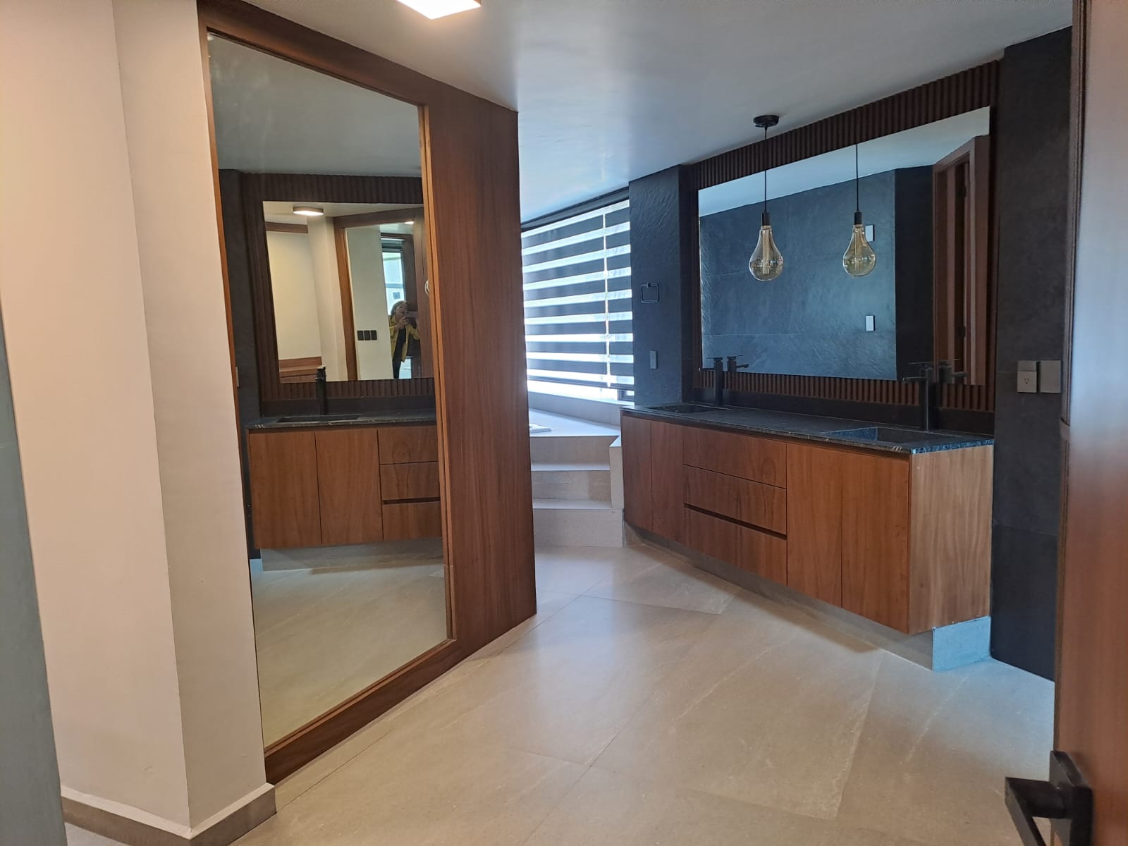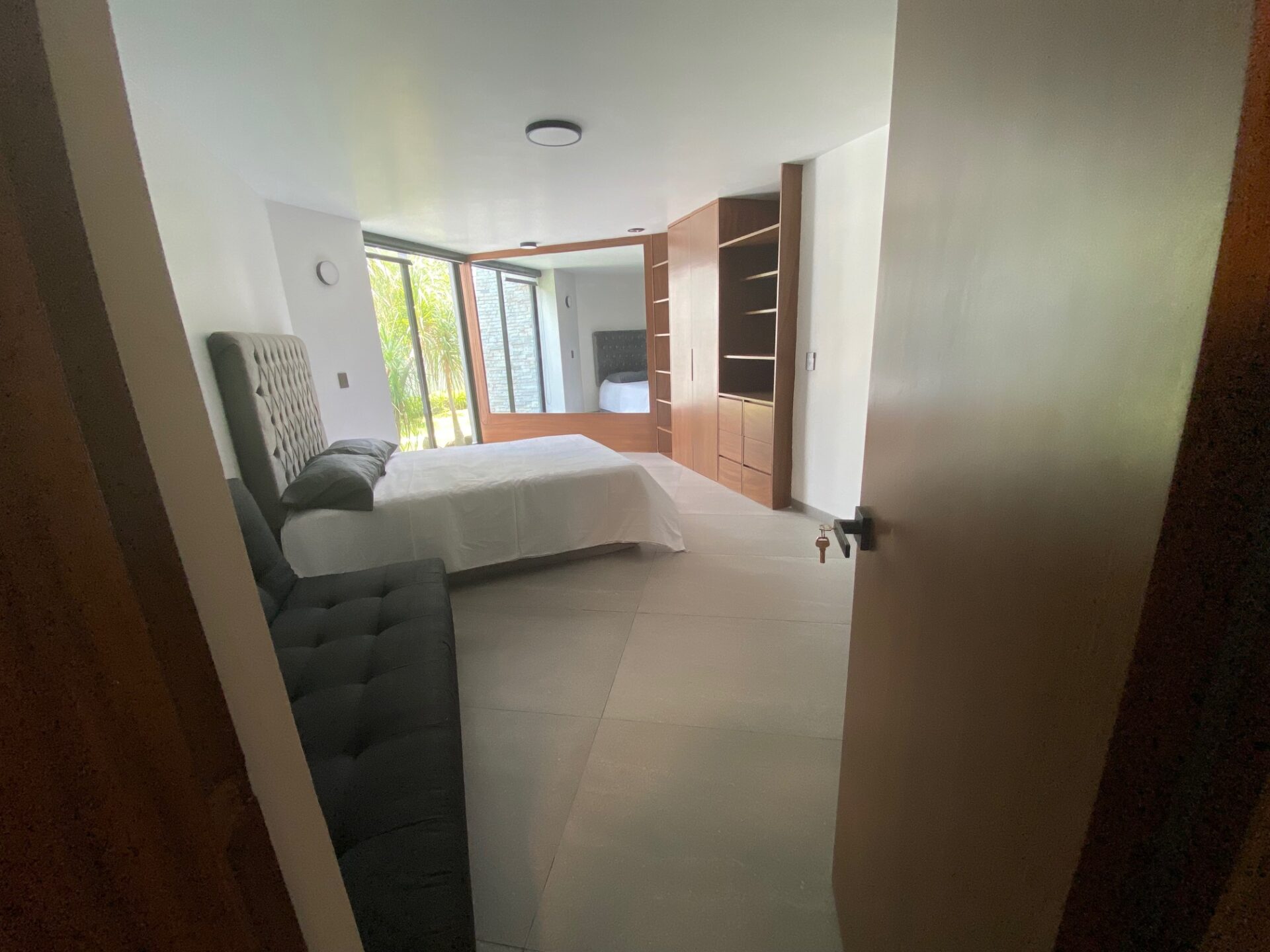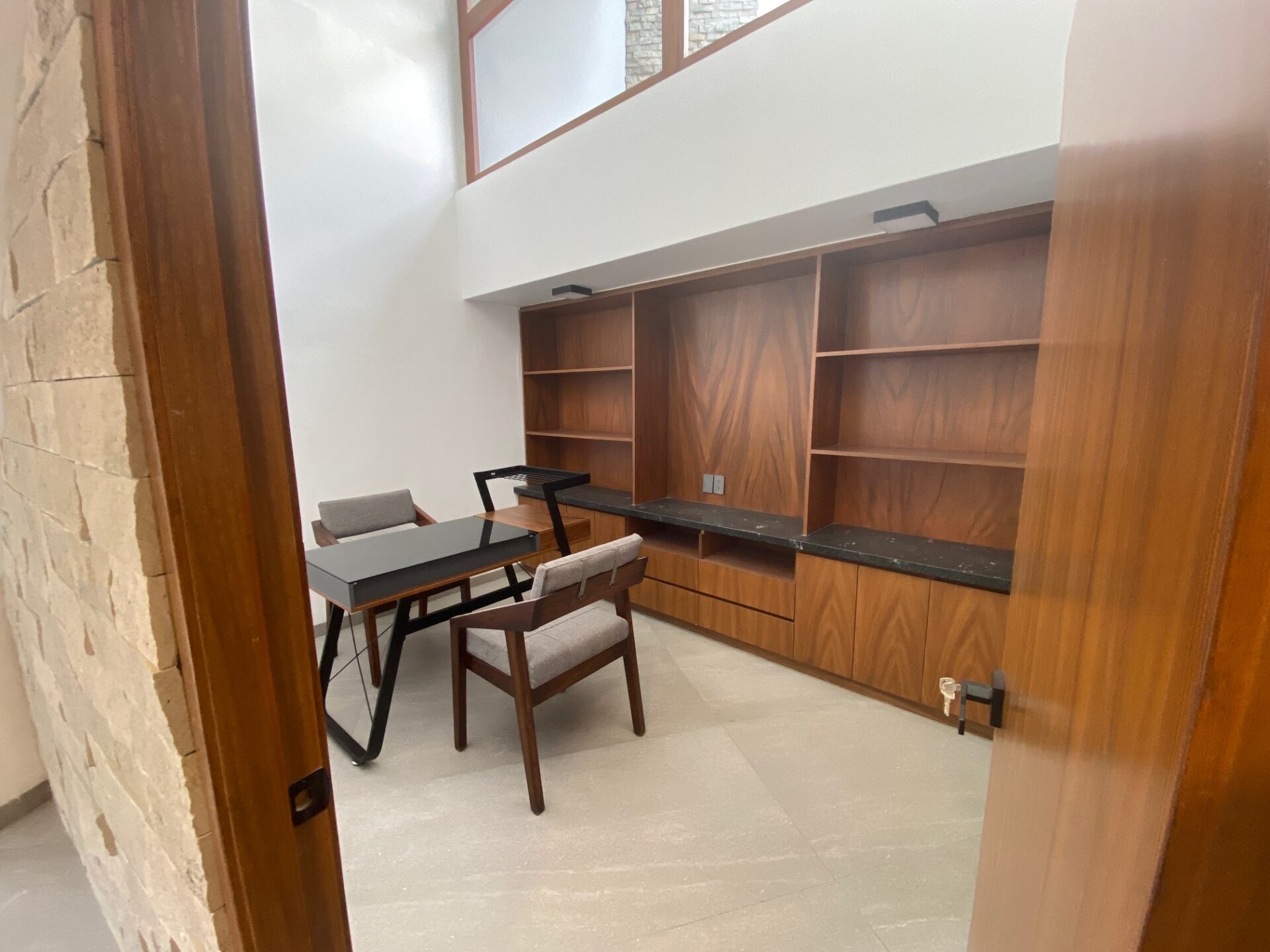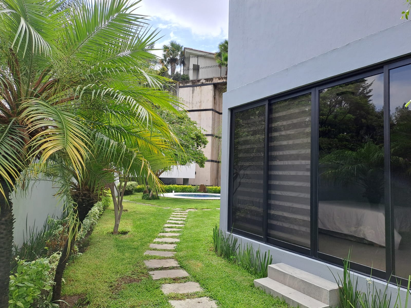 Subiendo unos escalones, en el jardín cuenta con un jacuzzi, la entrada principal de casa tiene un amplio recibidor y bar, estudio con libreros empotrados de parota, 3 recamaras una con vestidor y baño las otras 2 recamaras con closet y comparten baño un nivel más arriba se encuentra la recamara principal con doble vestidor, baño y jacuzzi.