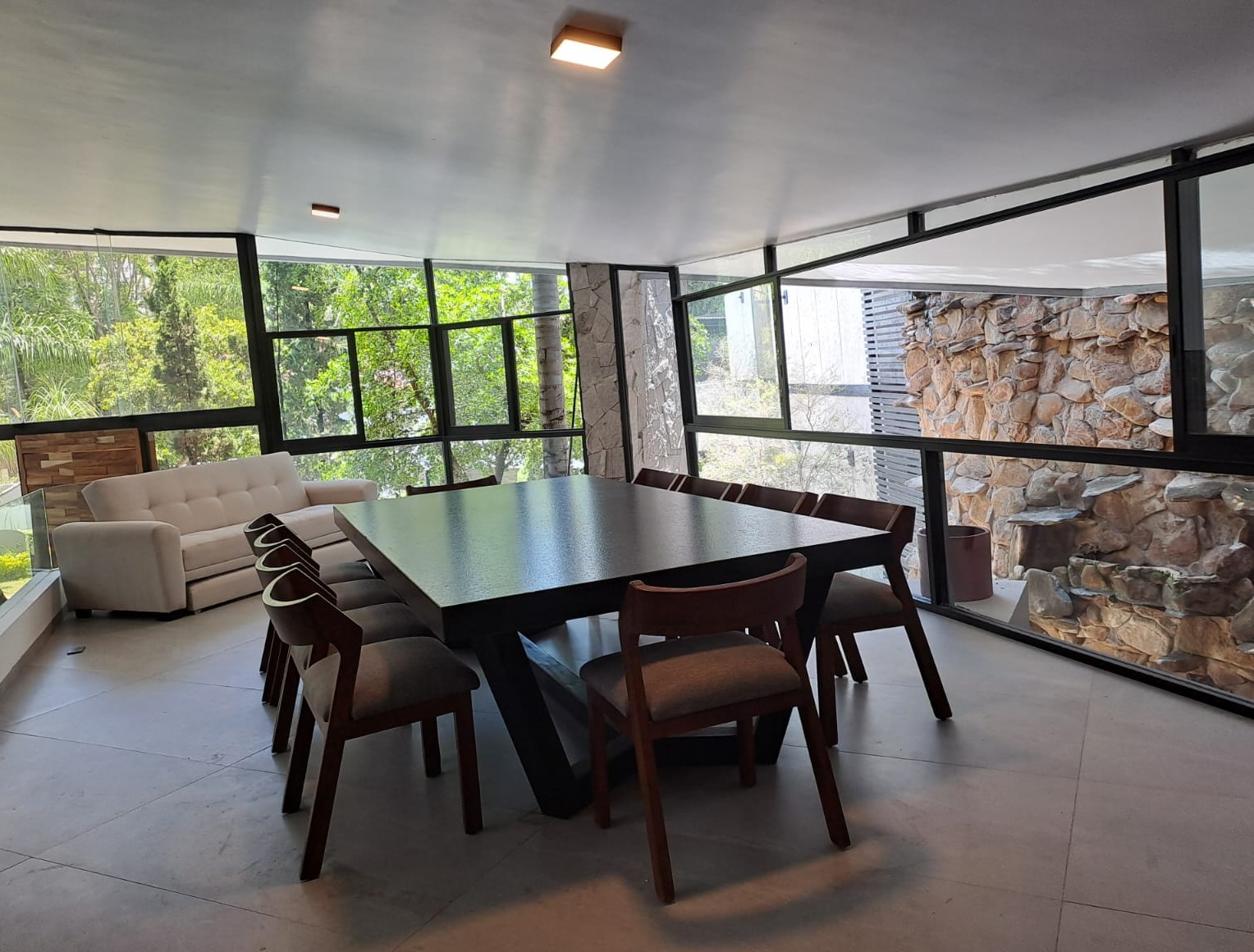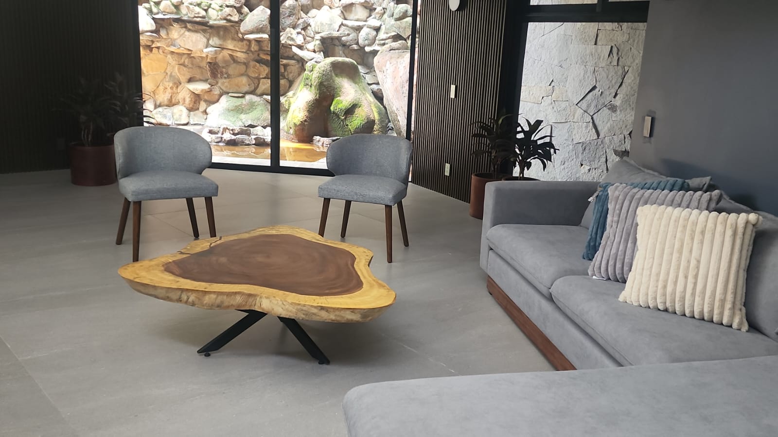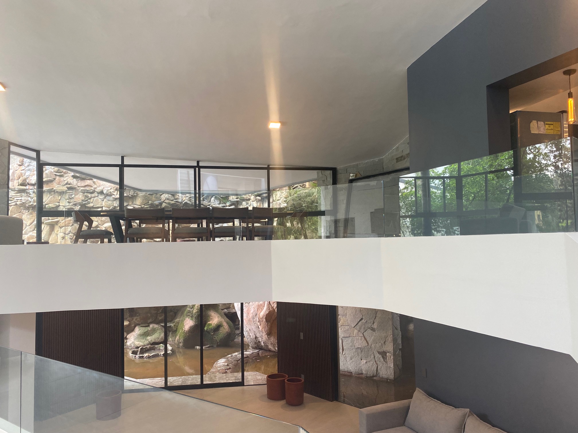 Del recibidor bajando unos escalones esta la sala, un medio baño, una despensa afuera la cascada con yasimiento de agua natural.