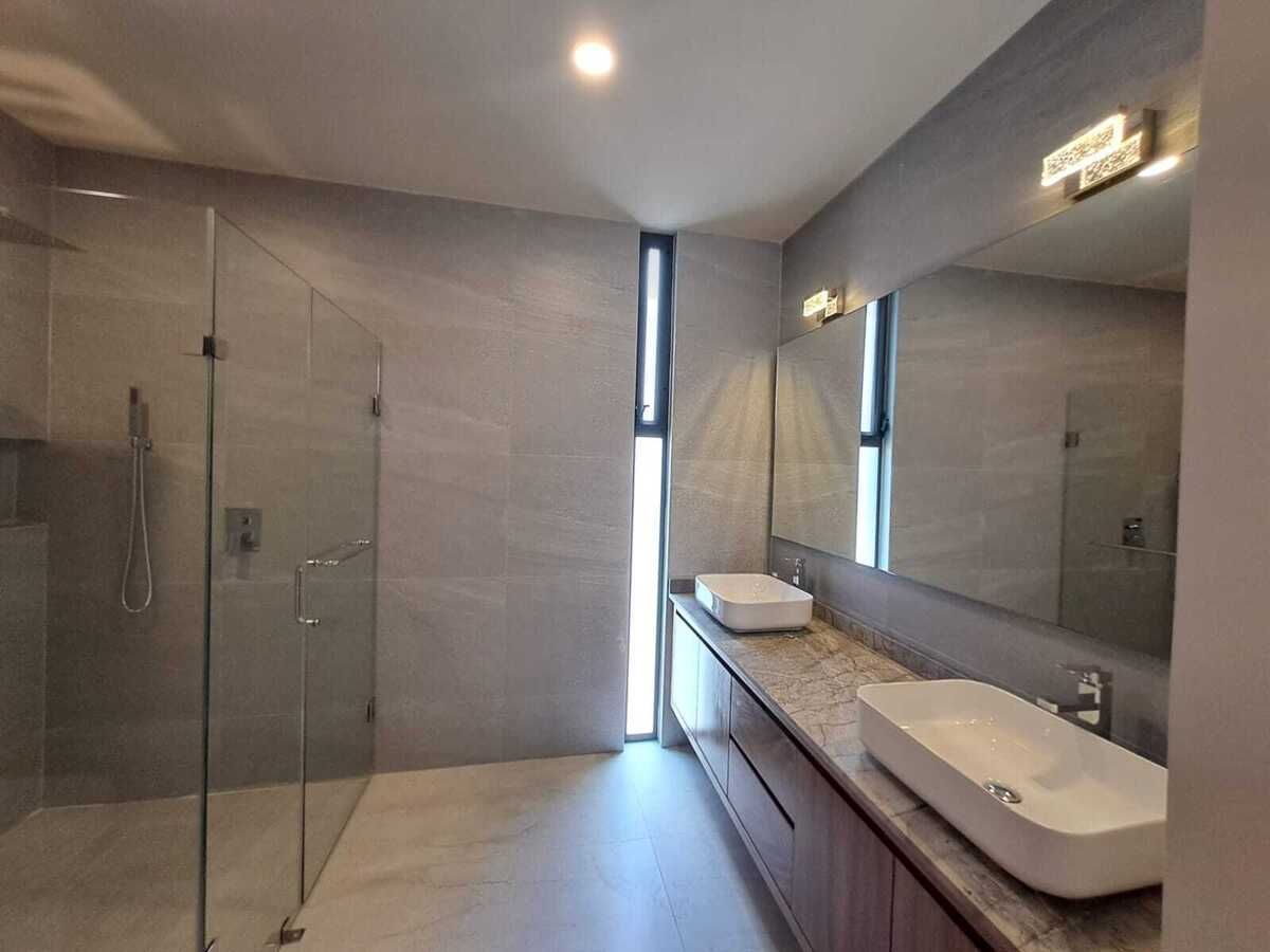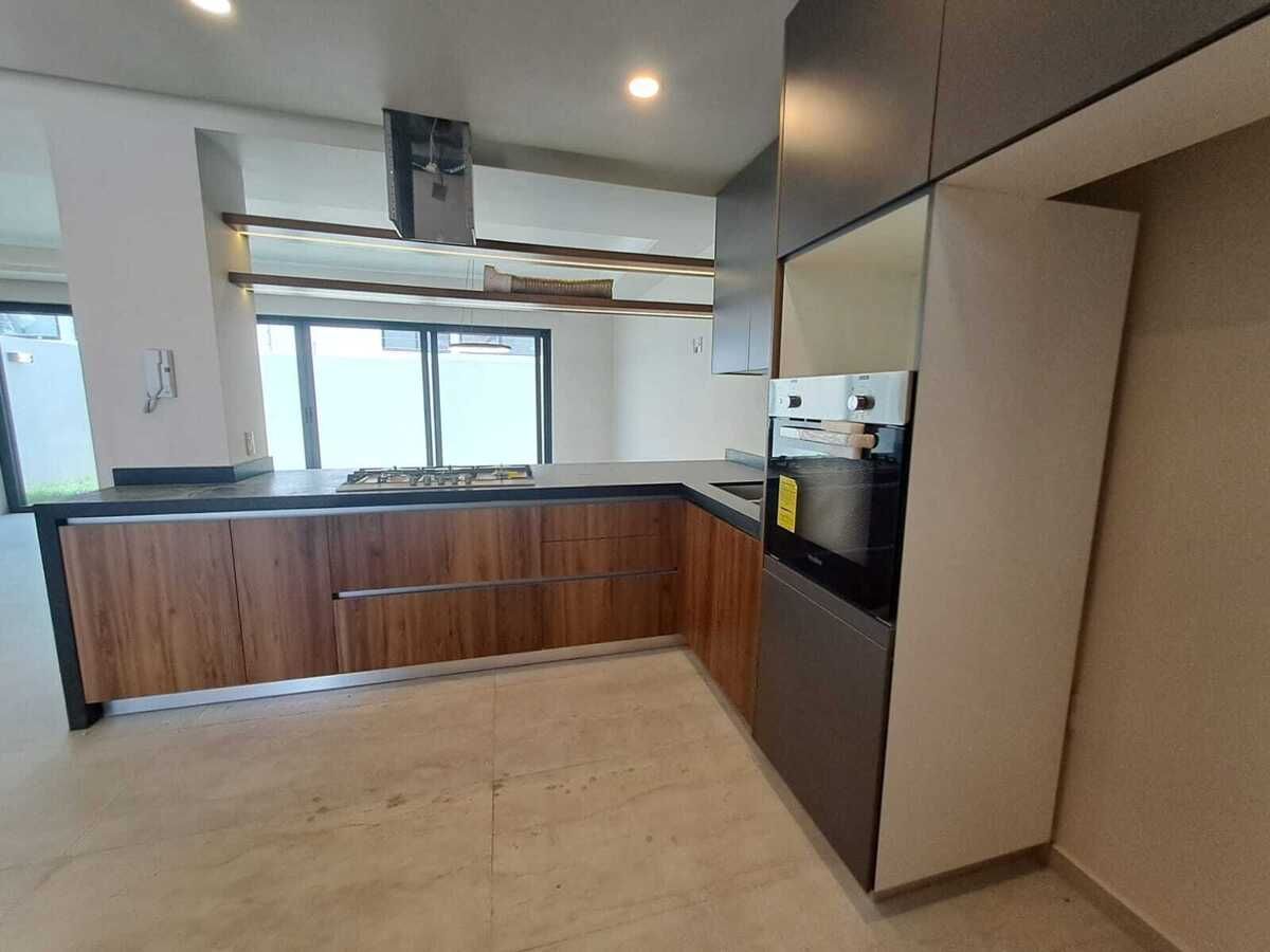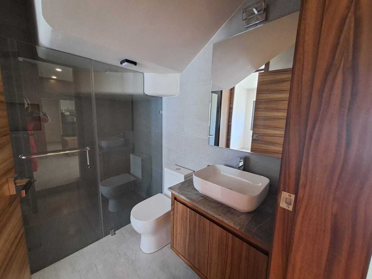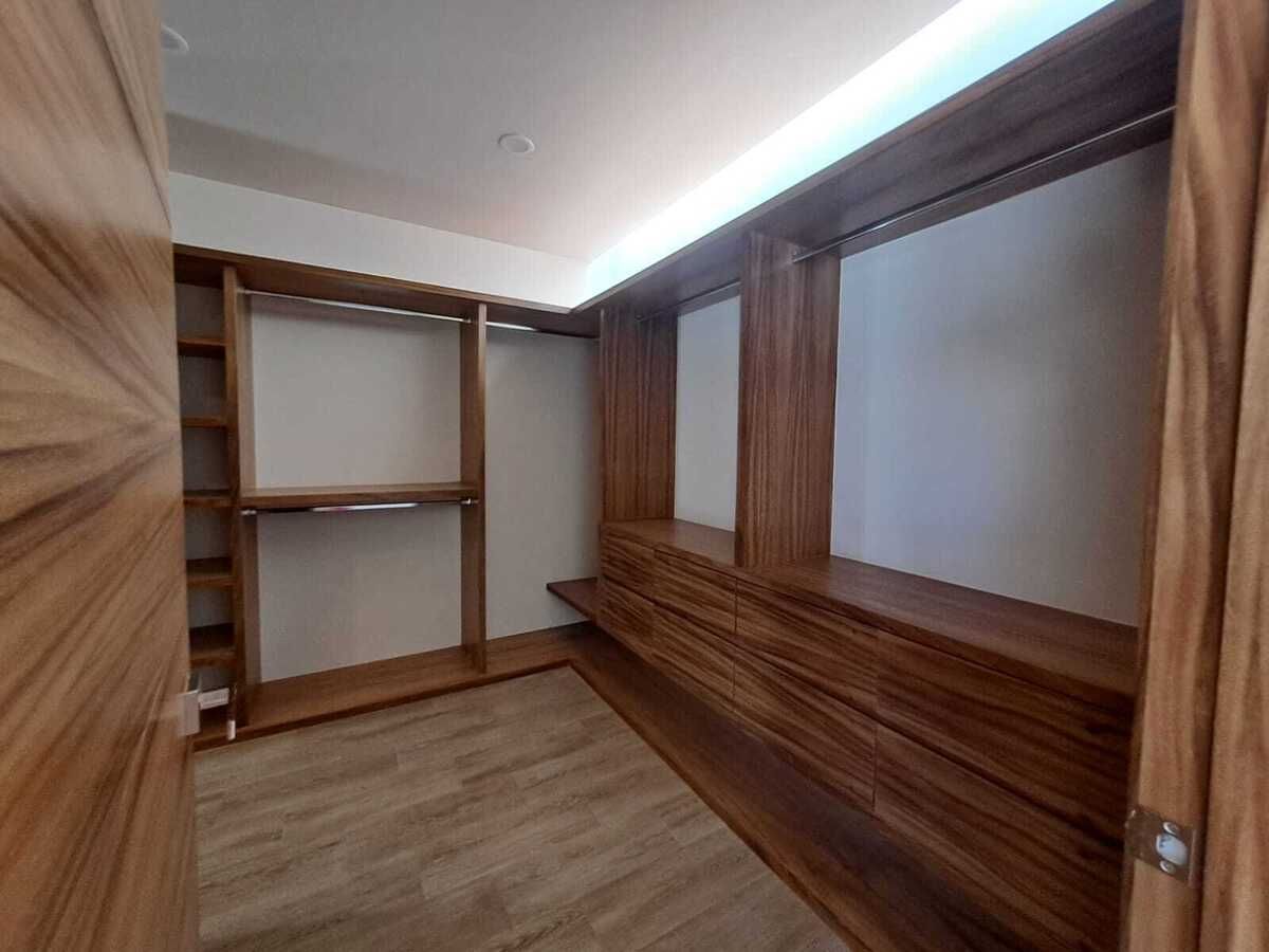 Terminados con madera de parota, piso de porcelanato, preparación para aire acondicionado en zonas principales y paneles solares, Hidroneumático
